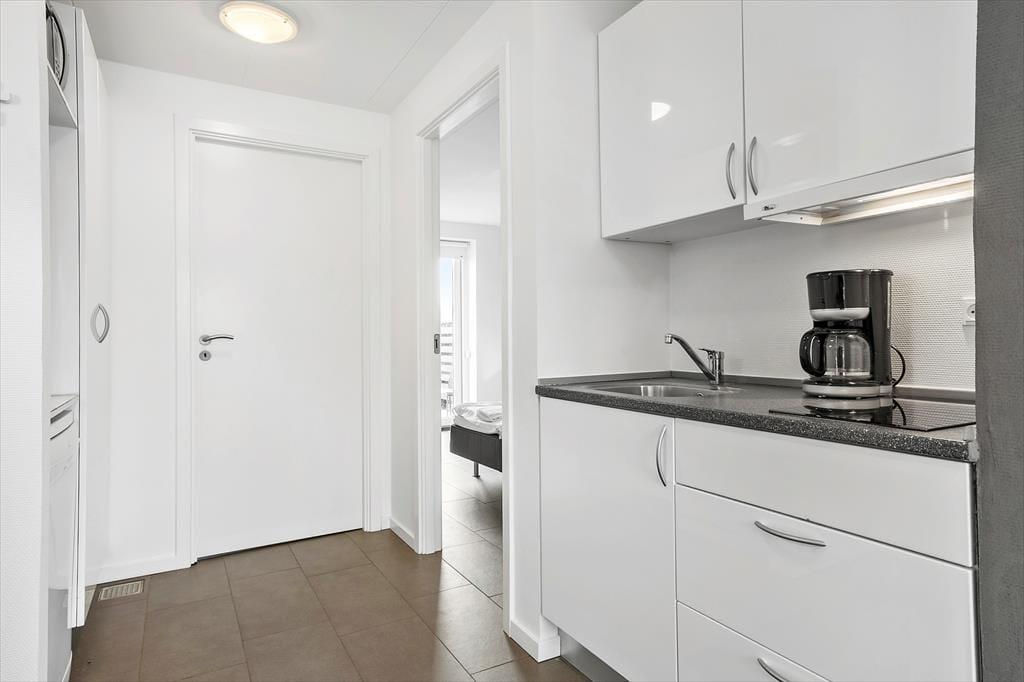 Her i stuelejligheden er atmosfæren lys og venlig, og de 65 m2 er godt udnyttede, så det er muligt at være fire personer og en hund inden døre. Ja, faktisk er der flere fordelingsmuligheder om natten, for ud over soveværelset er der mulighed for at overnatte på sovesofaen i stuen og på madrasserne på hemsen – og heroppe på hemsen er der for øvrigt også en spillekonsol, som kan underholde jer i løbet af dagen. Køkkenet er ikke så stort, men det er funktionelt indrettet, og derudover er det integreret med stuen, så du kan hyggesnakke med de andre, hvis det er dig, der har køkkentjansen.