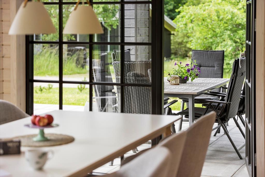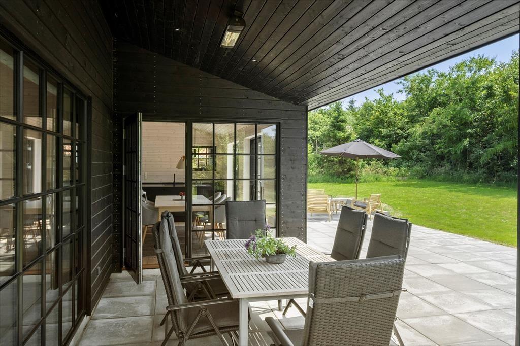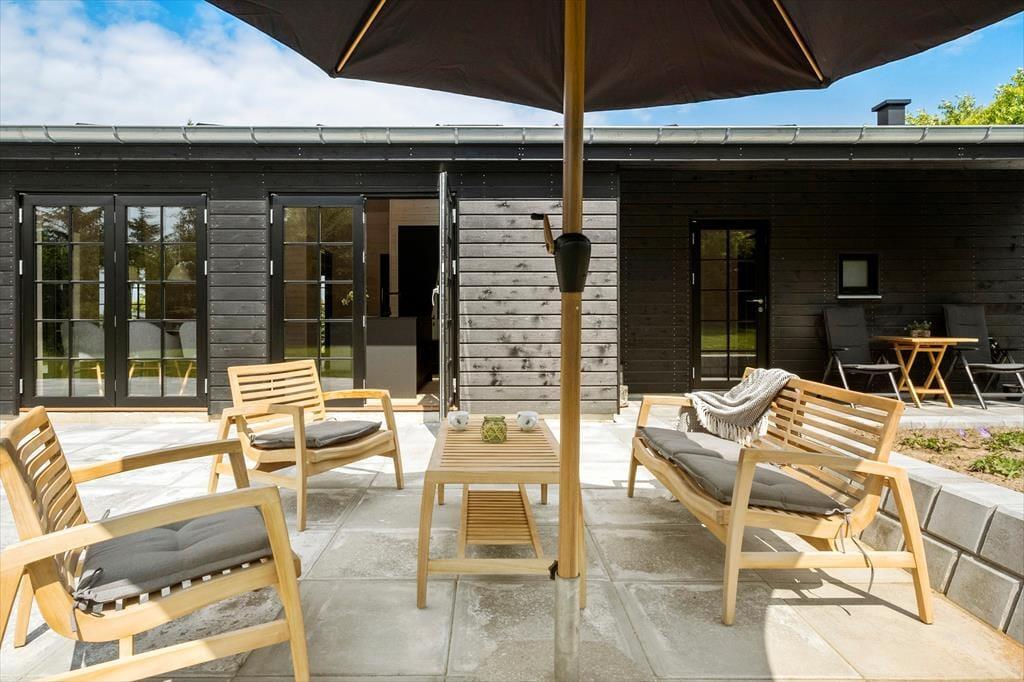 Udenfor finder du en stor og indbydende fliseterrasse, der både har en åben og en overdækket del. Her kan du nyde solen fra morgen til aften eller søge skygge, når du har brug for det. Terrassen er udstyret med gode havemøbler, liggestole og en parasol, så du kan slappe af i komfortable omgivelser. For børnene er der masser af plads til at lege og udforske naturen omkring sommerhuset og med kun en kort gåtur til stranden, kan du nemt tilbringe dagene med at bade og nyde den friske havluft.
