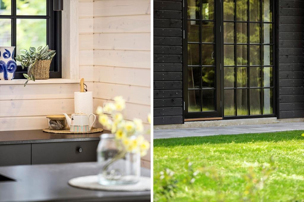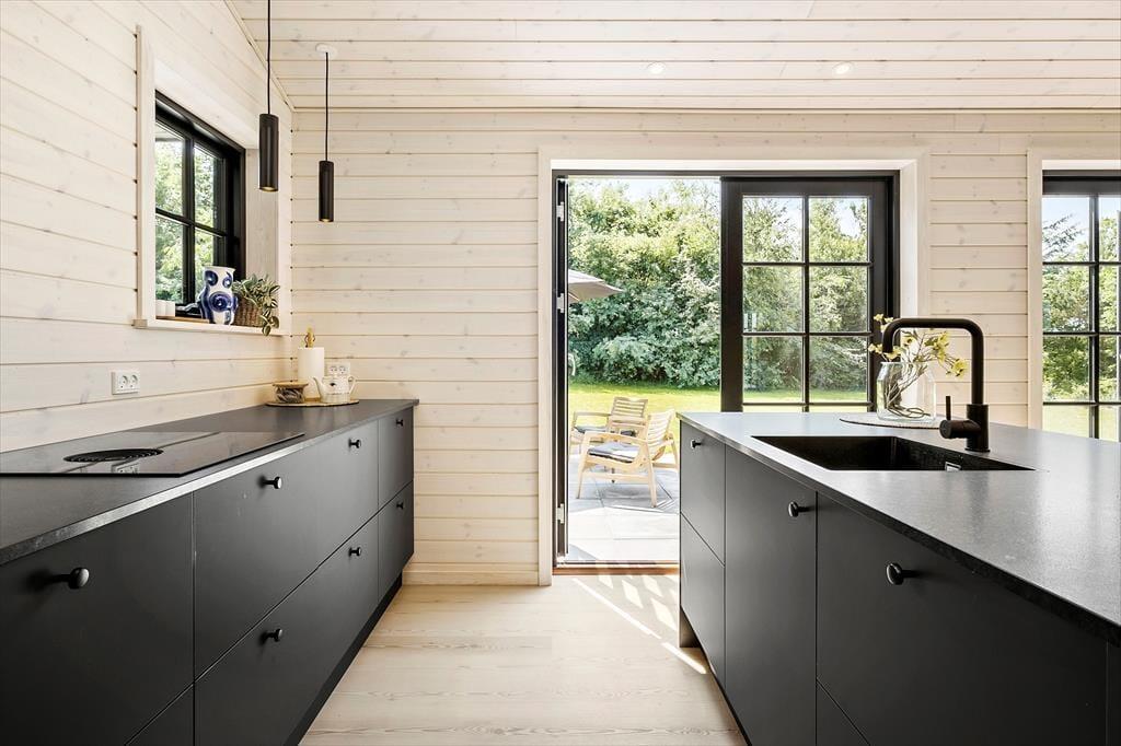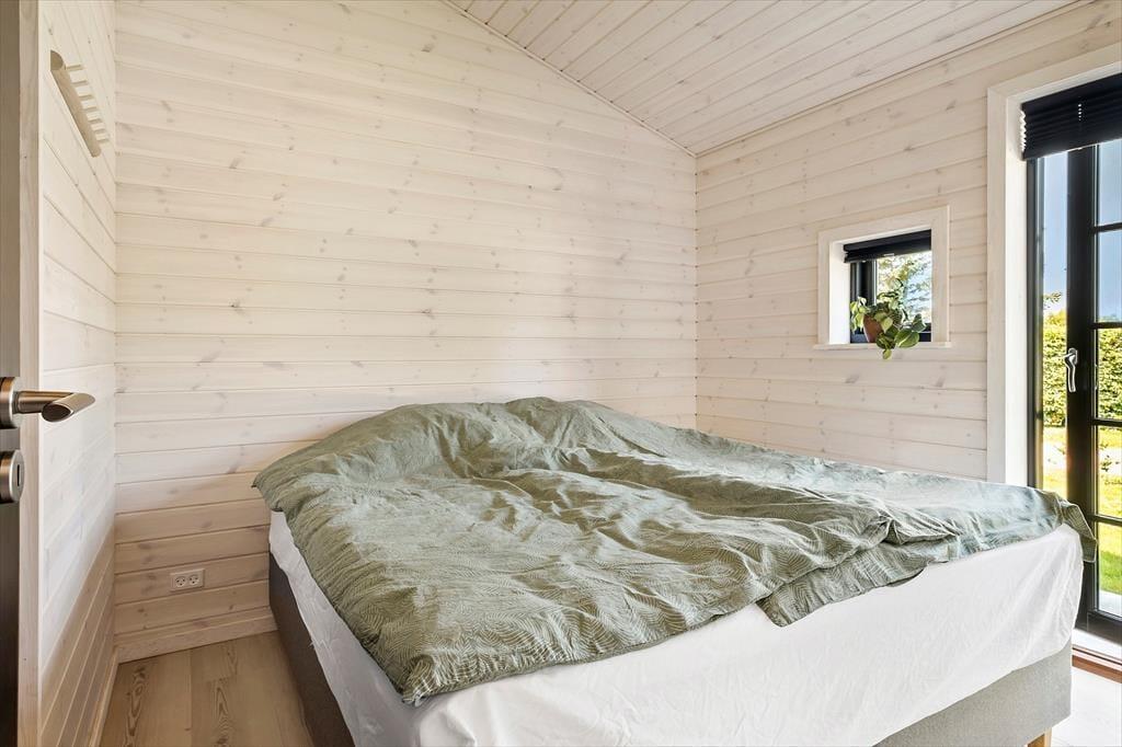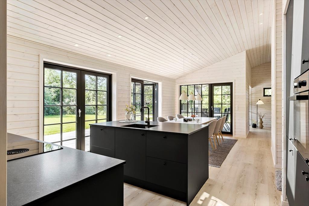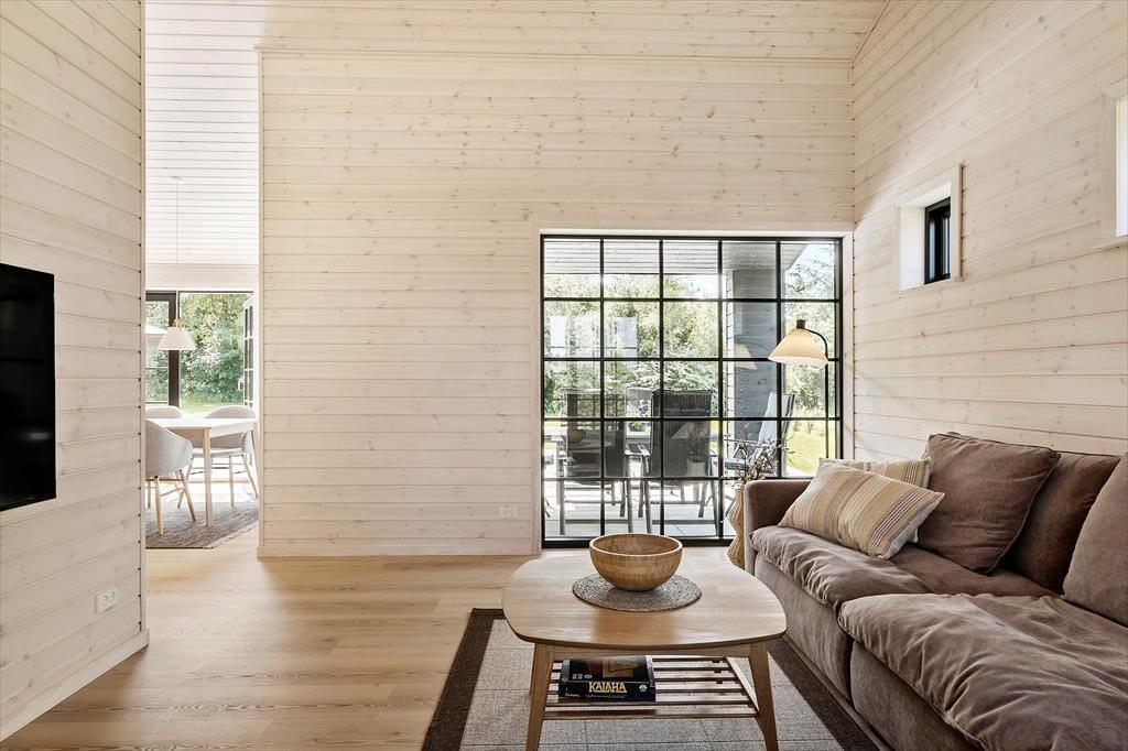 Når du træder ind i sommerhuset, mødes du af et moderne og stilfuldt interiør. Stuen er lys og rummelig med flotte "New Yorker"-vinduer og døre, der lukker masser af lys ind og giver en skøn udsigt til den omkringliggende natur. De komfortable møbler og den hyggelige atmosfære skaber det perfekte sted til afslapning efter en dag fyldt med aktiviteter. Det åbne køkken er udstyret med alt, hvad du behøver for at tilberede lækre måltider, herunder en emhætte integreret i induktionskogepladen. Det store spisebord indbyder til hyggelige middage med familien. Sommerhuset rummer tre soveværelser med behagelige senge, og de moderne badeværelser har alt, hvad du behøver for en behagelig ferie. Derudover er der gulvvarme i hele huset, hvilket sikrer en behagelig temperatur året rundt.