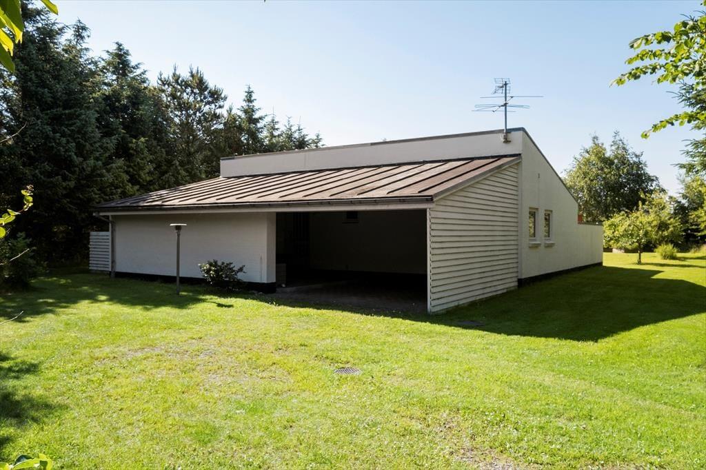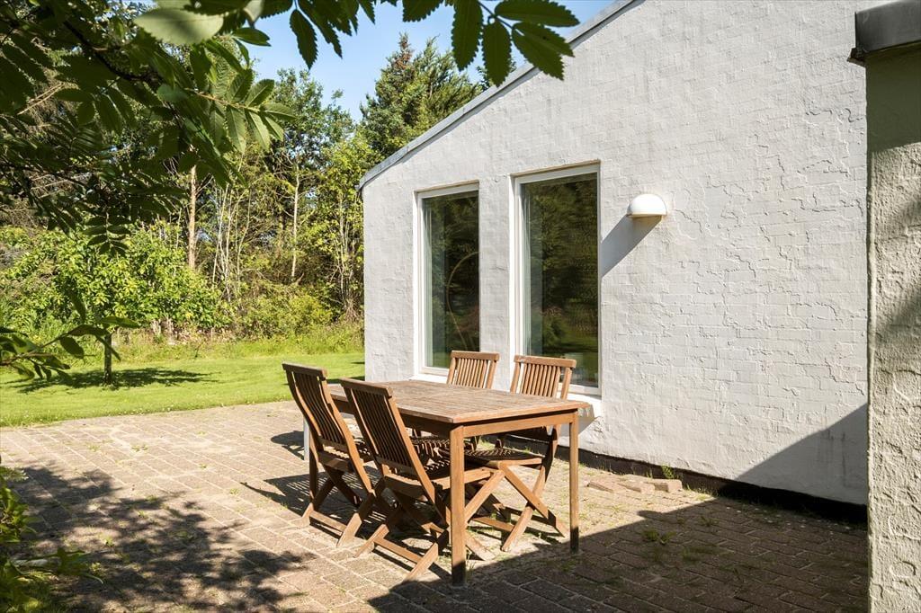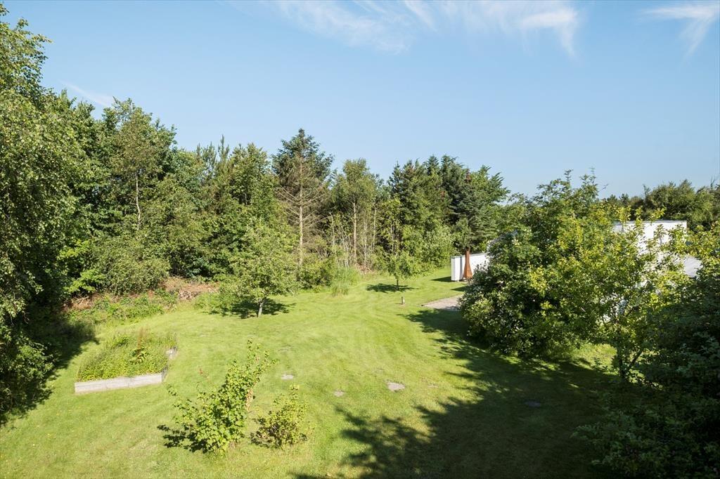 Grunden, som måler hele 2399 m2, er anlagt med en stor græsplæne og varieret randbeplantning, der skærmer huset mod naboerne. Ved sommerhusets to terrasser sørger plankeværk og mure derudover for læ, hvis vestenvinden skulle blæse. Terrasseudstyr som havestole, liggestole, parasol og grill er med til at forsøde sommerdagene - og så er der for øvrigt sandkasse til børnene og carport til bilen på grunden.