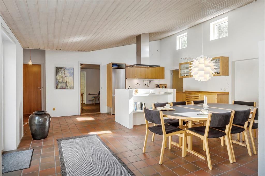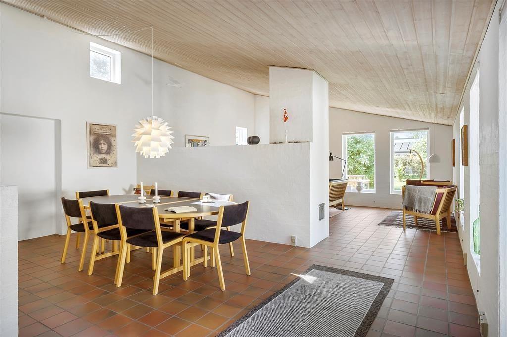 Sommerhuset har en spændende 1960’er-arkitektur med tag med ensidig hældning og vinduer i forskellige formater. Det har også betydning for rumfornemmelsen inden døre, for den gode loftshøjde, det gennemstrømmende lysindfald og de høje vinduer skaber en indbydende atmosfære. I det store opholdsrum, hvor spisekøkken og stue er forenet, er der installeret gulvvarme, og på de kølige aftner kan I tilmed tænde op i brændeovnen, når I hygger jer i sofaafdelingen. Udover opholdsrummet består planløsningen af et badeværelse, et praktisk bryggers og fire gode soveværelser med i alt syv sengepladser.