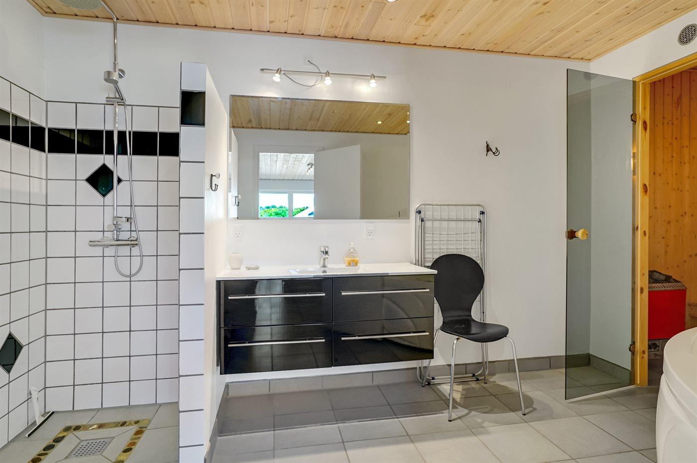 Der er 2 badeværelser med bruseniche og 2 toiletter. Der er gulvvarme på 2 badeværelser. I saunaen er der mulighed for afslapning.