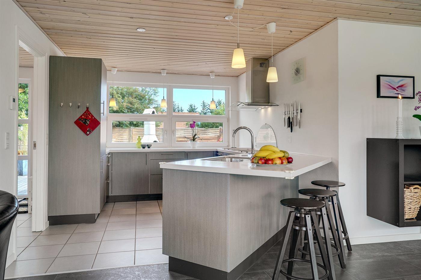 Køkkenet er udstyret med 1 køleskab. Der er 4 keramiske kogeplader, varmluftovn, mikrobølgeovn samt opvaskemaskine.