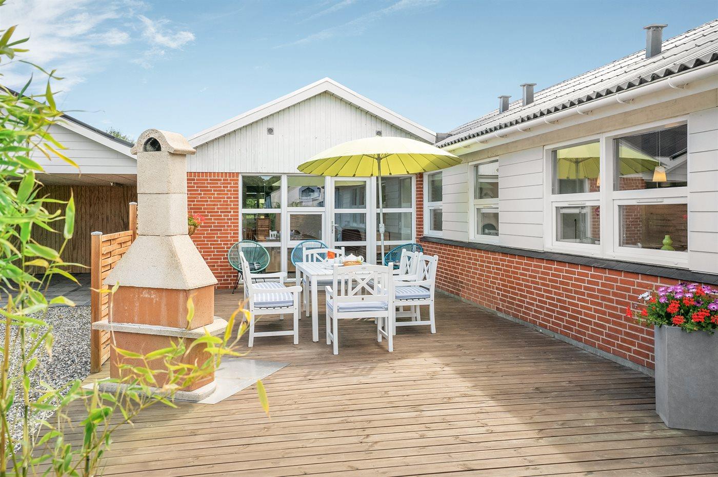 Ferieboligen er beliggende på en 1190 m² stor havegrund. Grunden er indhegnet. Der er 600 m til havet. Nærmeste forretning er beliggende i en afstand af 2500 m. Der er en golfbane i en afstand af 10000 m. Til ferieboligen hører 200 m² terrasseareal. Gynge. Sandkasse. Trampolin. Rutchebane. Vippegynge. Petanque. Fodboldmål. Bålsted. Udendørs bruser. På lune aftener sørger en udendørs pejs for hyggelig stemning. Der er carport til rådighed. Der er installeret stik til opladning af elbil. CEE stik. Parkering ved ferieboligen.