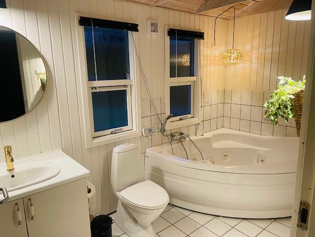 Indenfor er huset lyst og åbent med kip i lofterne, hvilket giver en følelse af rummelighed. Sommerhuset byder på to hemse, hvor de større børn kan have deres egen hyggekrog. Der er også to badeværelser, hvoraf det ene er udstyret med både spabad og sauna.