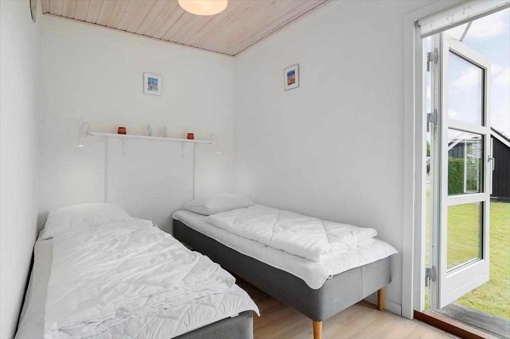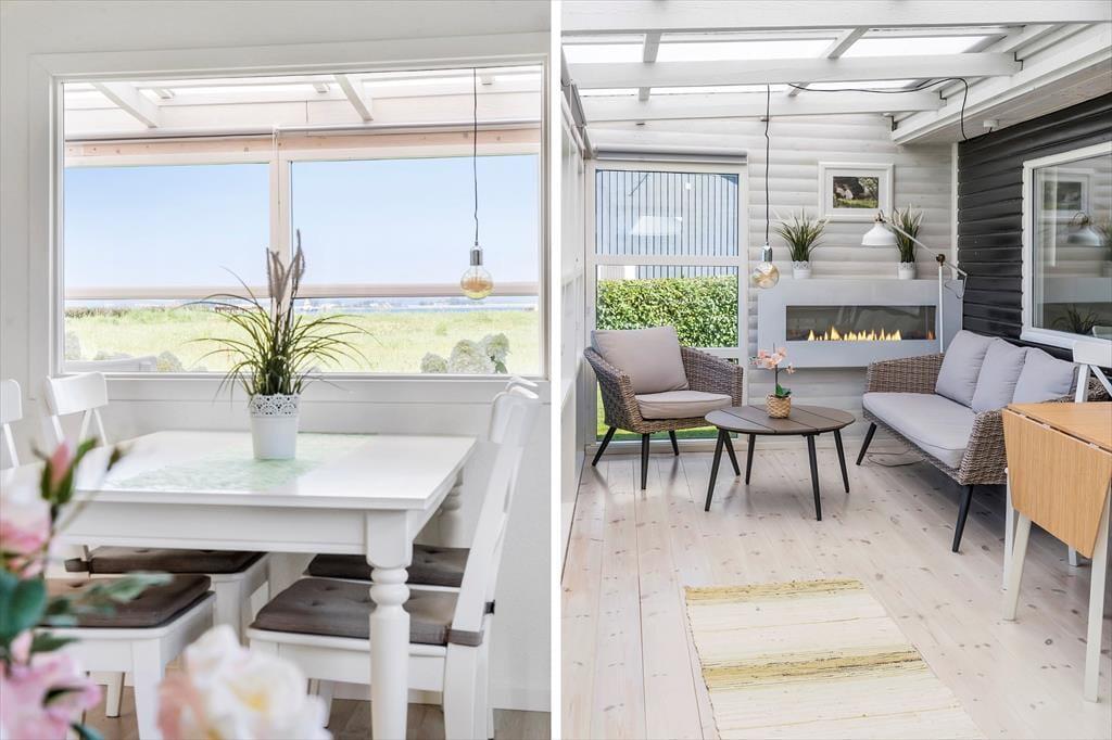 I sofaen foran det store vinduesparti er der rigtig hyggelig sommerhusstemning. Det er perfekt at sidde her med en bog eller tænde for en god film. Her kan I virkelig slappe af og nyde ferien.