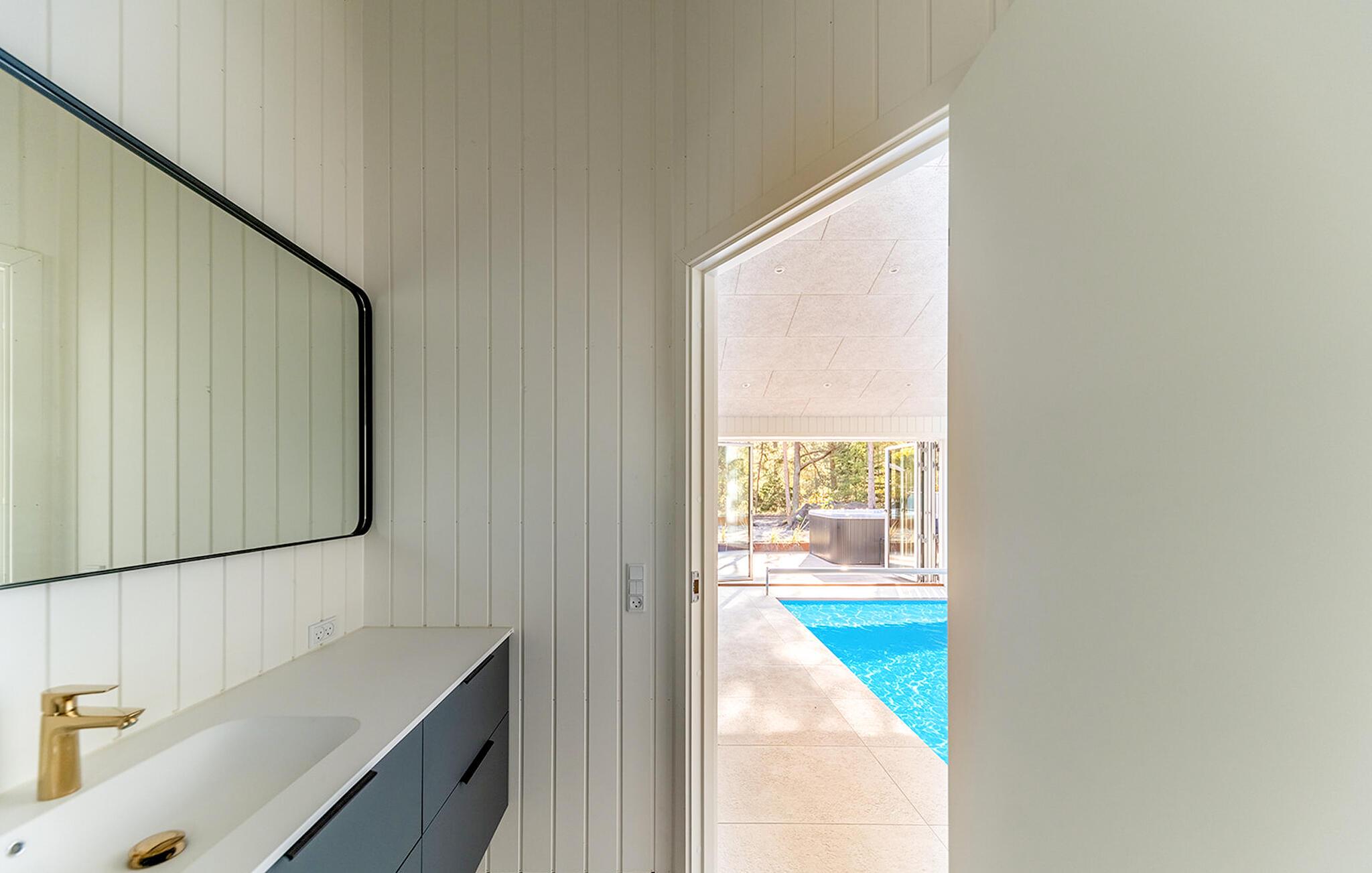 Moderne feriehus i Snogebæk med pool, sauna, spabad og privat sti til stranden.
