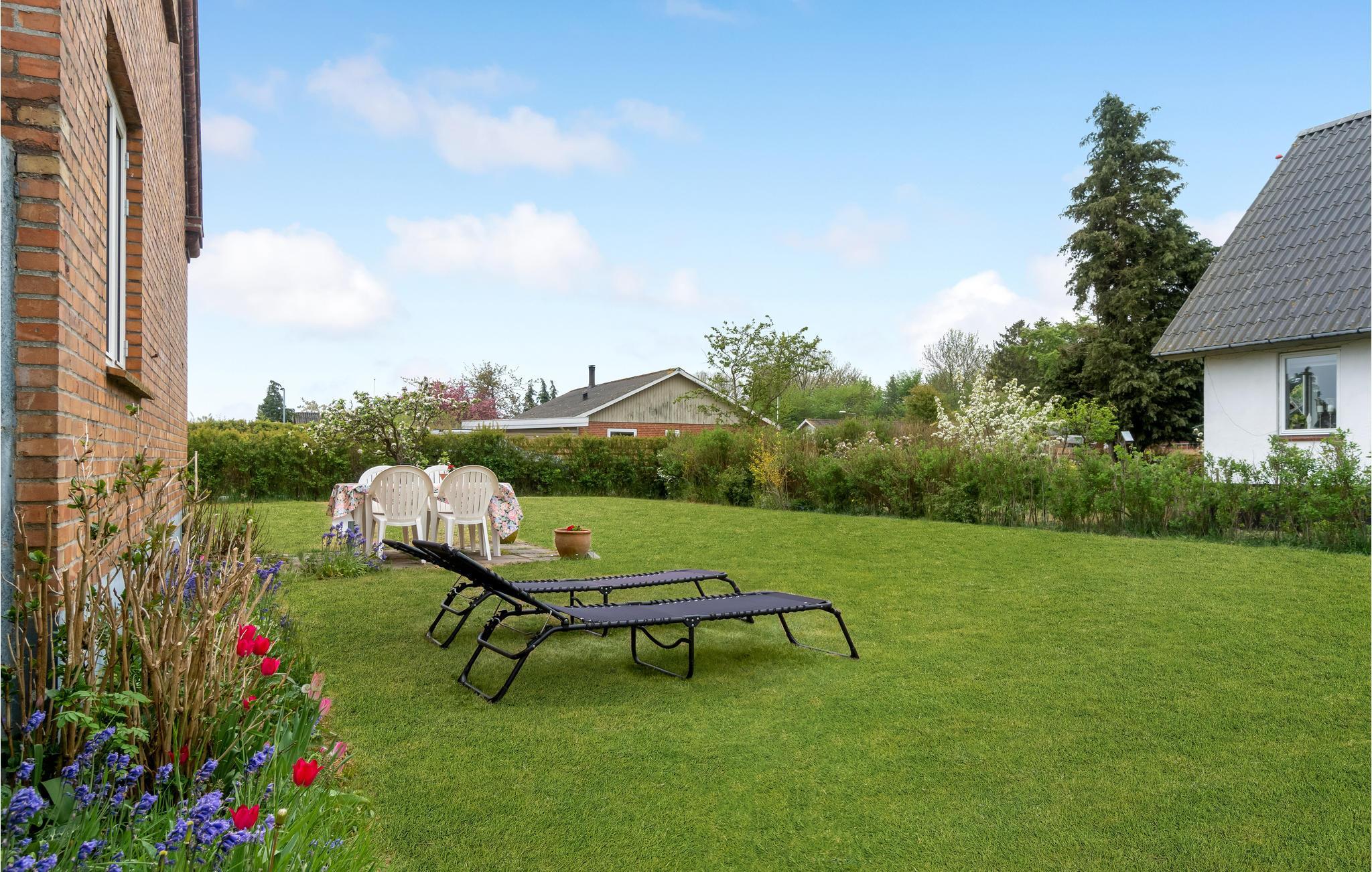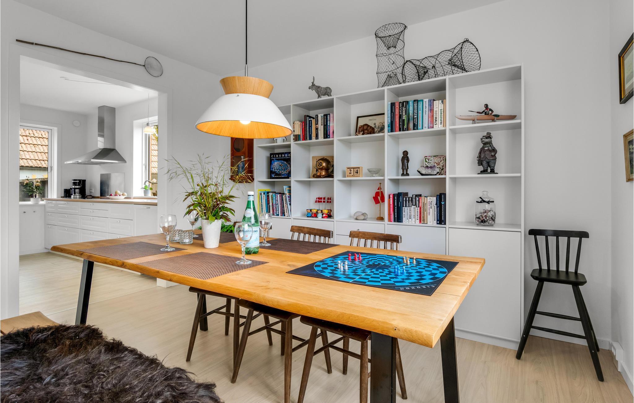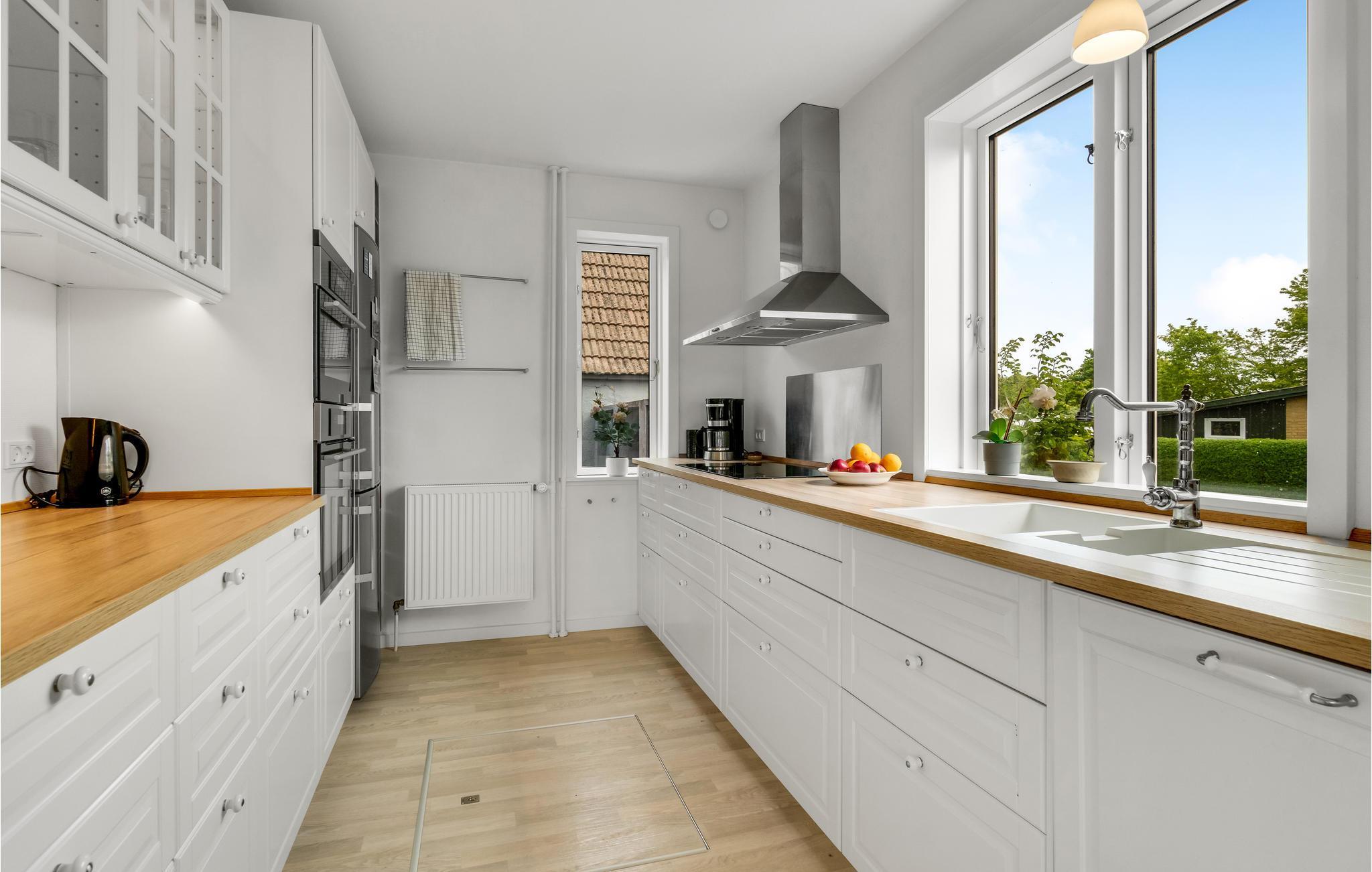 I den hyggelige og rolige landsby Snogebæk finder I dette rummelige feriehus i to etager med en lys atmosfære, der vækker ro og balance. Store familier eller to familier, der holder ferie sammen, kan her se frem til fælles madlavning, hyggebagning, brætspilskonkurrencer, leg, filmaftener og sene aftenstunder med cocktails for de voksne. Tilbered lækre måltider i det store hjemlige køkken og nyd en lækker brunch ved spisebordet. I den smukke have finder hele familien plads til at slå sig løs. Begynd ferielæsningen på liggestolene, mens de små leger på græsplænen.