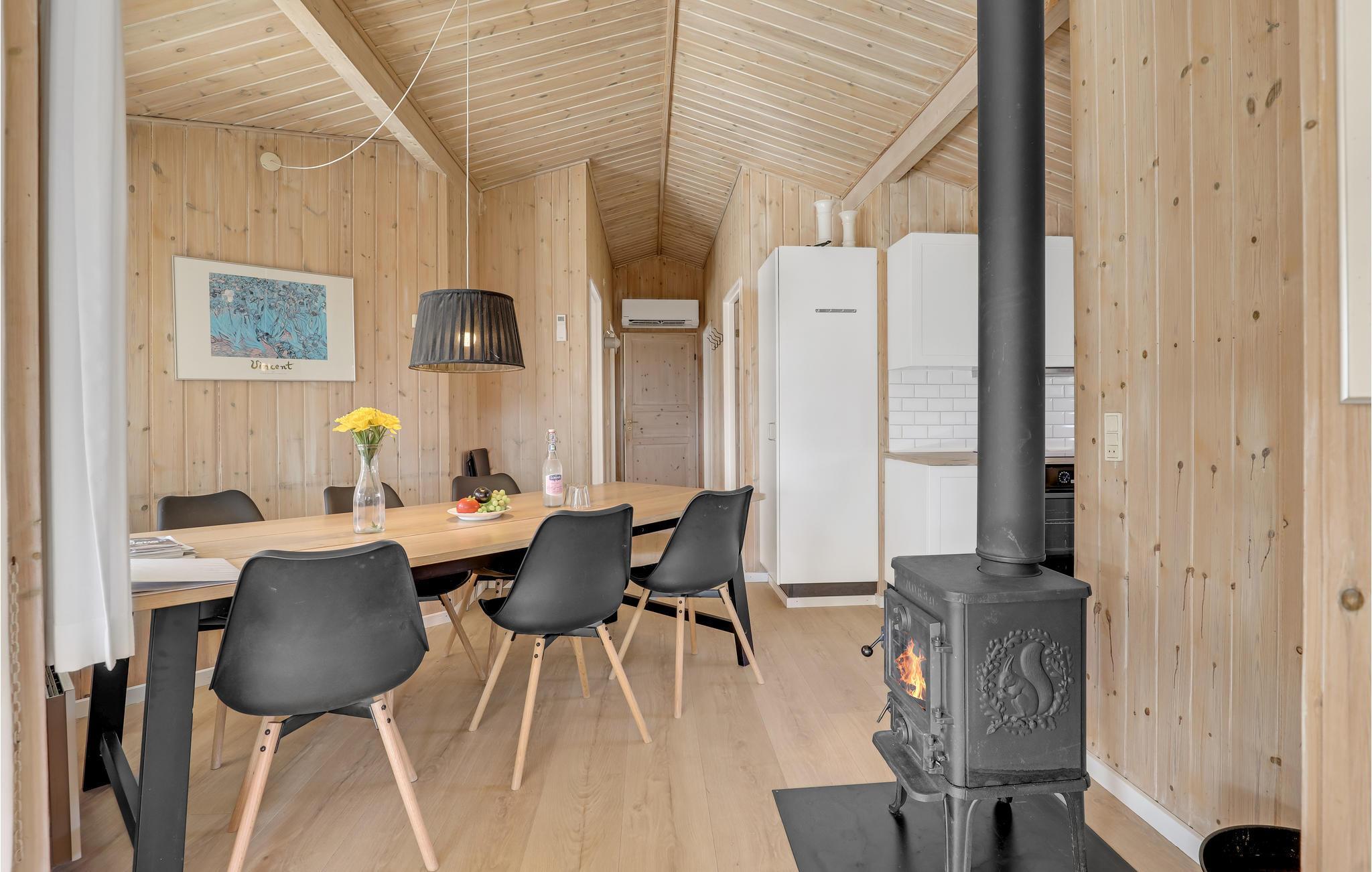 Velkommen til dette feriehus, der med sine trægulve, vægge- og lofter i kombination med åbent til kip i stue og køkken skaber en rummelig, lys og hyggelig atmosfære. I stuen kan I slappe af og se fjernsyn, lytte til musik eller bare hyggesnakke. I forbindelse hermed ligger spisepladsen og det åbne køkken. Huset badeværelse er lidt af et højdepunkt. Det er nemlig udstyret med gulvvarme, vaskemaskine og tørretumbler og sidst men ikke mindst dejlige wellnessfaciliteter i form af spa og sauna. Derudover består huset af et gæstetoilet og fire soveværelser.