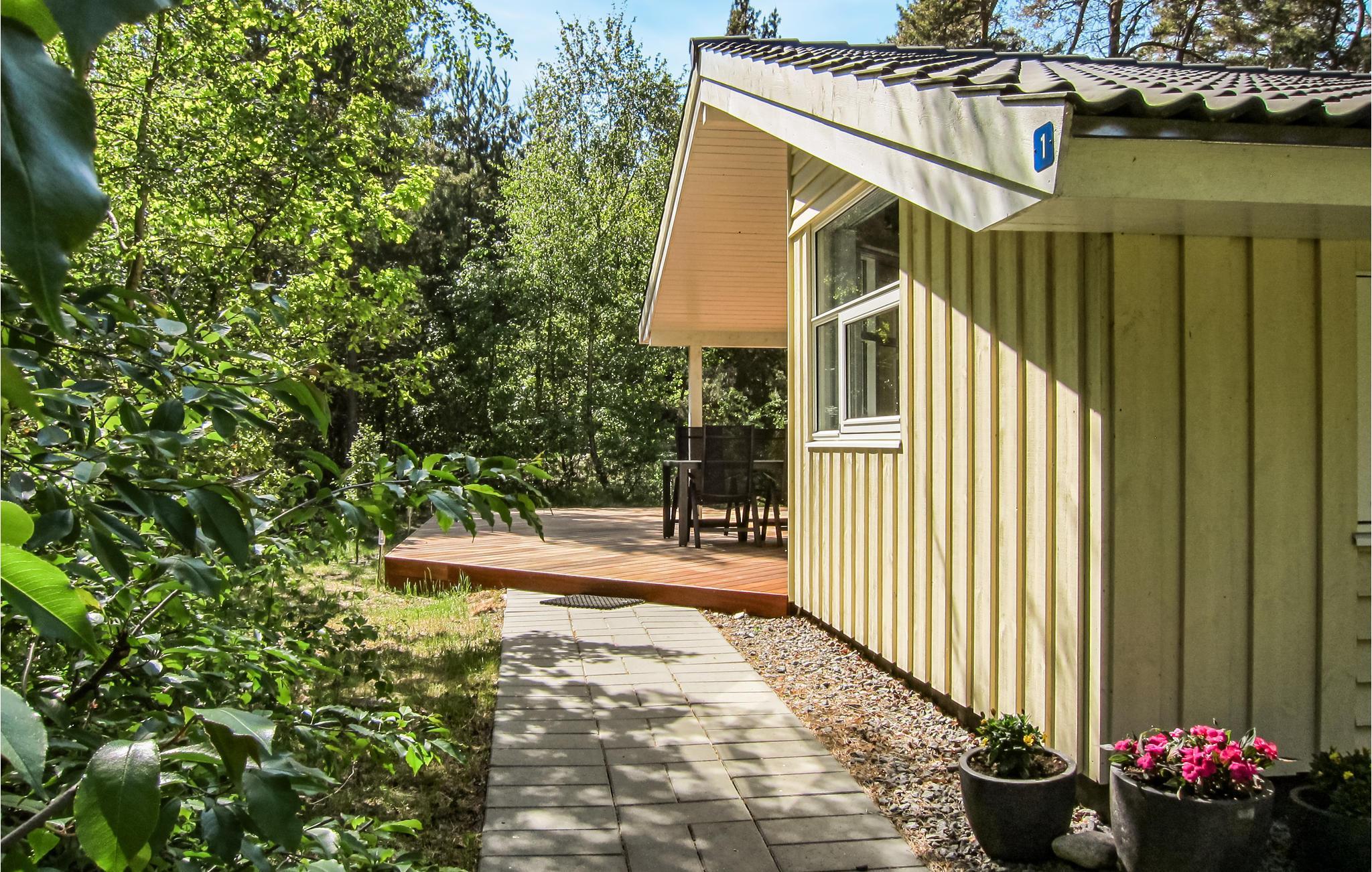 Hyggeligt træsommerhus nær Snogebæk Strand med stor terrasse og kun 250 meter til badestrand.