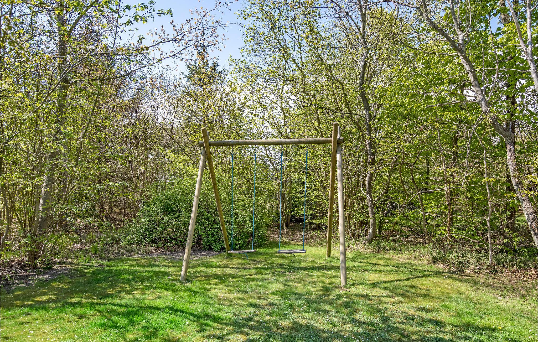 Overdækket og solrig terrasse med grill og havemøbler på rolig grund, med gyngestativ og plads til leg eller afslapning i liggestole.