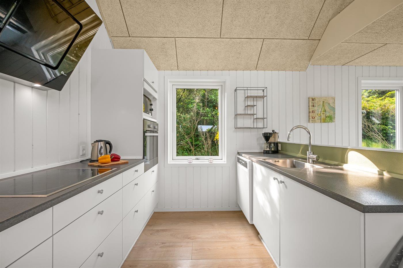 Køkkenet er udstyret med 1 køleskab. Der er 4 keramiske kogeplader, varmluftovn, mikrobølgeovn samt opvaskemaskine.