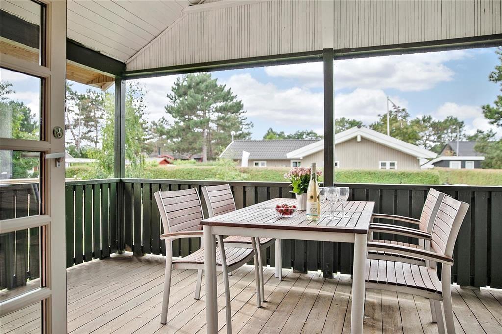 Huset har en 498 m2 grund, og en delvis 17 m2 overdækket træterrasse og en åben fliseterrasse. Ved feriehuset er der havemøbler og gasgrill
