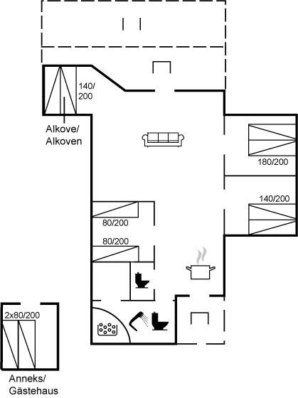 Bemærk, at der er flere sovemuligheder i huset, da der ud over tre soveværelser er en alkove i stuen og to sovepladser i annekset, men huset må maksimalt bookes til 8 personer.