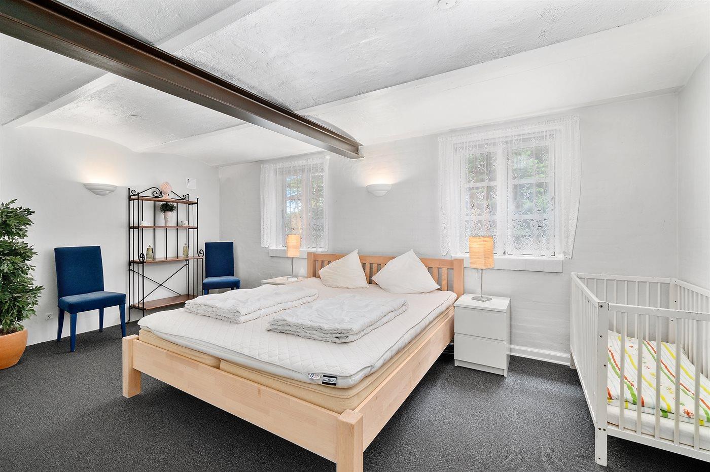 Der er i alt 5 soveværelser. Sovepladserne fordeler sig på: 10 sovepladser i dobbeltsenge. Derudover er der 2 stk. barnesenge.