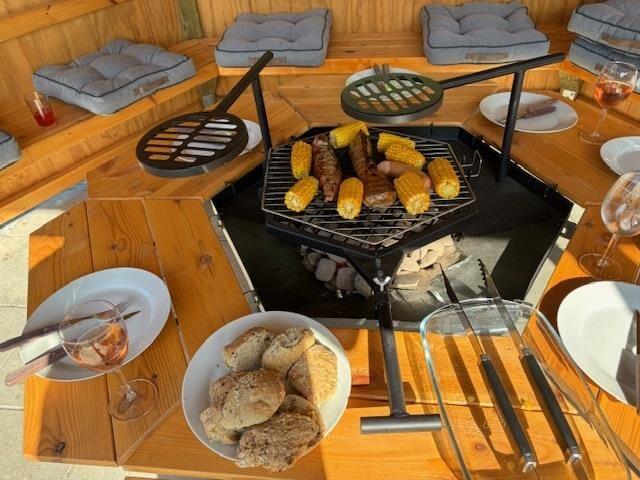 Nyd livet udenfor: Udenfor er der eventyr i vente. Den store og gedigne tipihytte, som kan rumme op til 10 personer, byder på unikt samvær og hygge. Med et stort ildsted i midten kan I samles omkring flammerne, fortælle historier om gamle dage, lave snobrød og grille. Og det er faktisk ikke mindre hyggeligt, hvis det regner, for I sidder i læ og tørvejr under kulørte lamper. Den store græsplæne inviterer til leg og boldspil, mens terrassen, der omkranser halvdelen af huset, giver masser af plads til afslapning. En del af terrassen er overdækket, så du kan nyde udendørslivet, når duggen falder og uanset vejret. Børnene vil elske legepladsen med gynge, rutschebane og sandkasse, hvor de kan tilbringe timevis med sjov og leg. Der er flot bevoksning omkring næsten hele grunden.