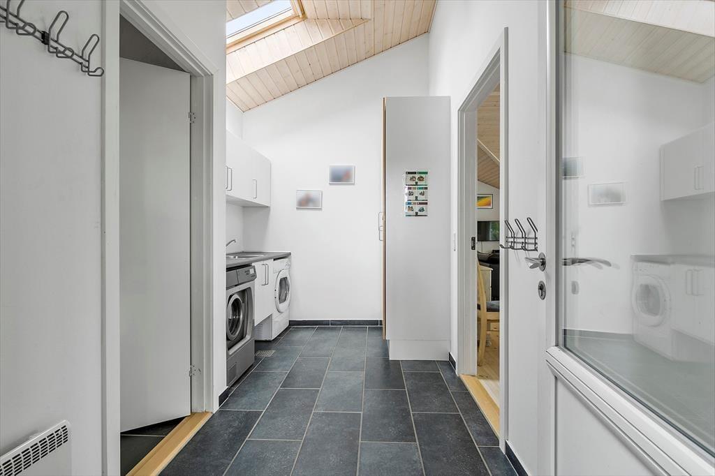 Velkommen indenfor: Når du træder ind i dette sommerhus, mødes du af en følelse af rummelighed og lys. Huset er kendetegnet ved en fantastisk rumfordeling, der sikrer, at hvert hjørne kan udnyttes optimalt. De høje lofter skaber en luftig atmosfære, og de store vinduer lader solens stråler danse gennem rummene. I husets midtpunkt finder du køkkenet, spisestuen og stuen, som smelter sammen til et hyggeligt samlingssted for familie og venner. Her kan du nyde aftener ved brændeovnen, mens flammerne knitrer og spreder varme eller du kan slappe af til en film eller sport foran det store TV. De fire gode soveværelser sikrer, at alle har deres eget private tilflugtssted og hemsen er perfekt til børnene. To dejlige badeværelser gør morgenrutinerne lette og ubesværede – det ene badeværelse er endda udstyret med både spa og sauna, så du kan forkæle dig selv med lidt ekstra luksus efter en lang feriedag. Som en praktisk detalje er der også et bryggers, der gør det nemt at håndtere små udfordringer som vasketøj og opbevaring af barnevogn, overtøj og sko.