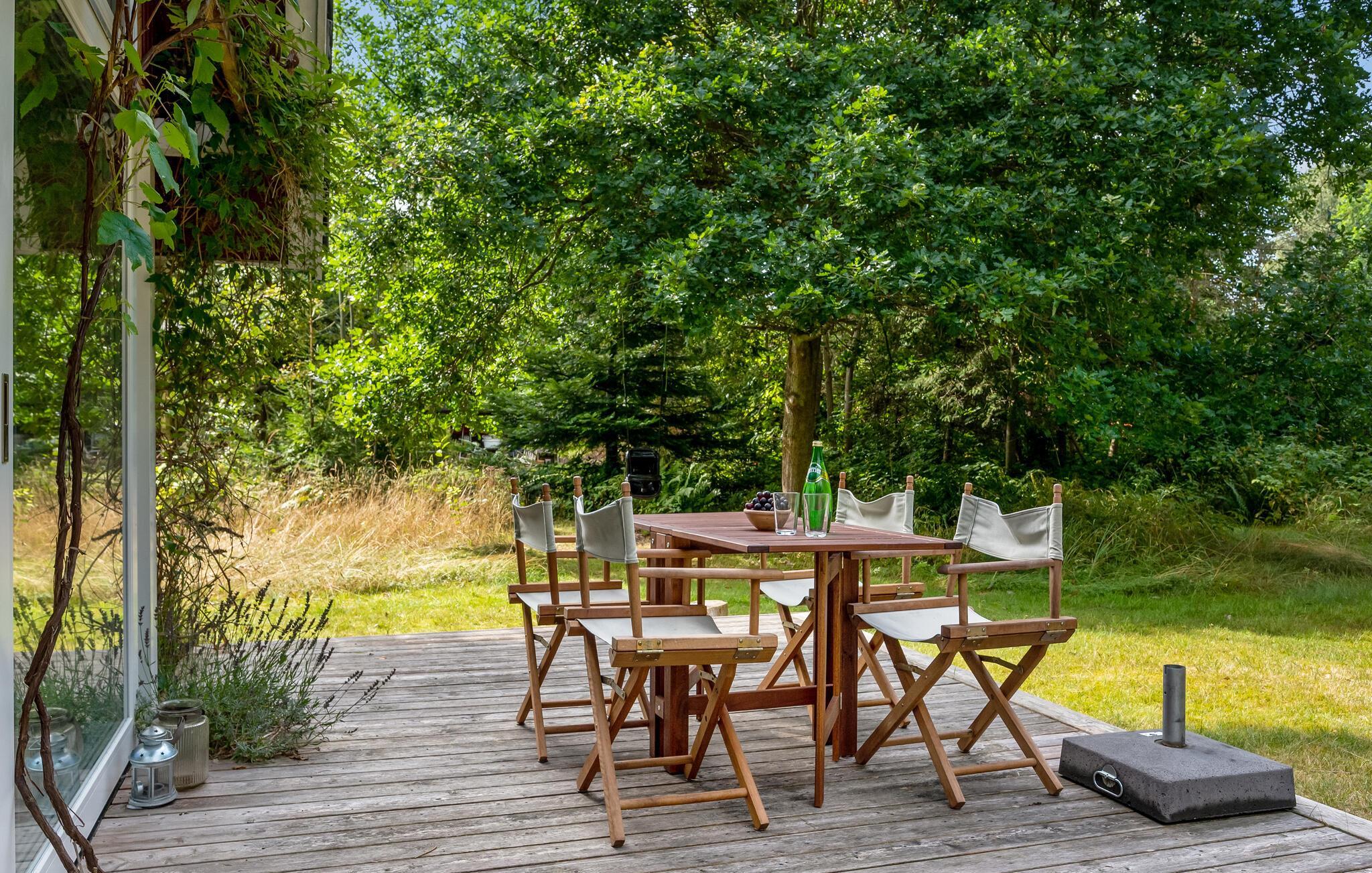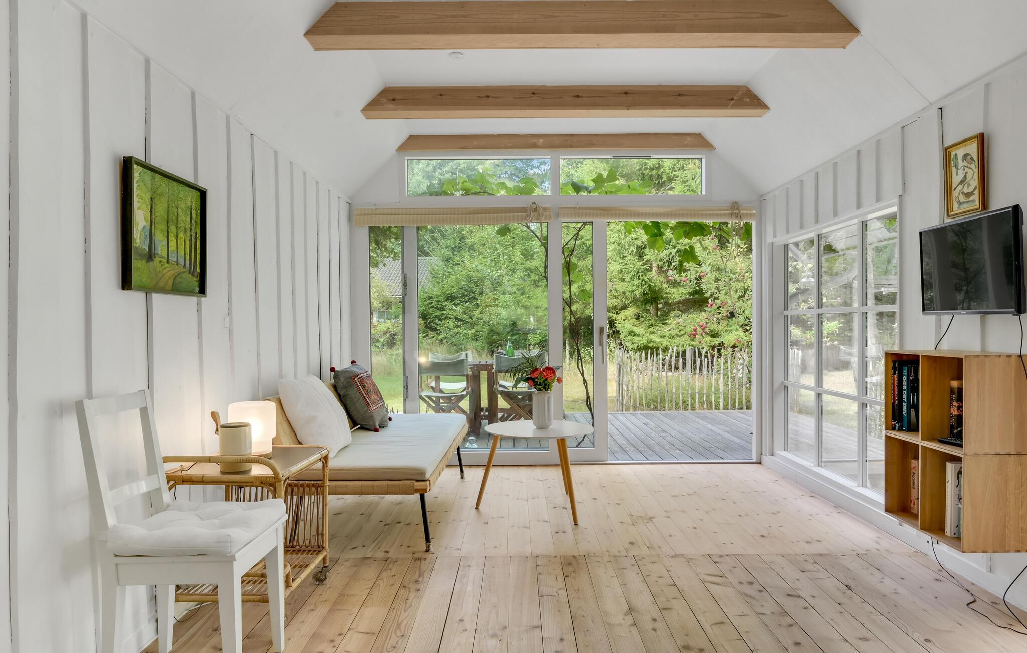 Træd ind i dette smukke feriehus og mærk roen sænke sig med det samme. Den lyse stue med brændeovn er husets hjerte, hvor I virkelig kan slappe af. I forlængelse ligger køkkenet, hvor I kan lave mad, spise og hygge jer. Ud over soveværelset i huset er der endnu et soveværelse i annekset i haven. Haven er en stor oase af velvære. Nyd jeres lækre feriemåltider på terrassen, mens I beundrer den omkringliggende natur, træerne, buskene og blomsterne.