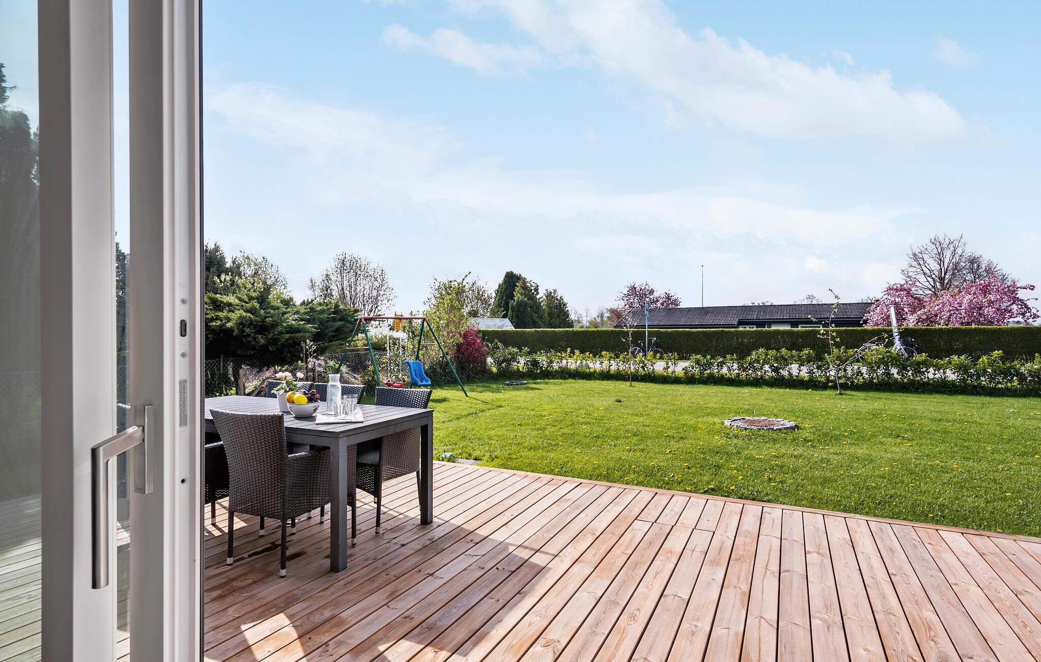 Udendørsområdet byder på en møbleret terrasse og masser af plads til at slappe af. Mens børnene hygger sig på græsplænen, kan I afslutte dagen i den friske luft eller nyde måltiderne udendørs.