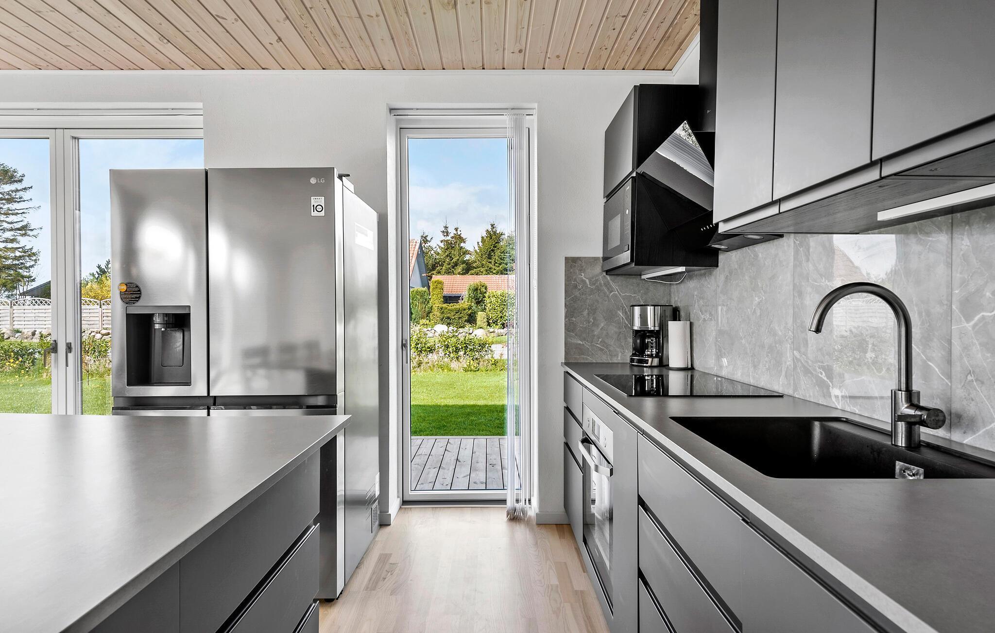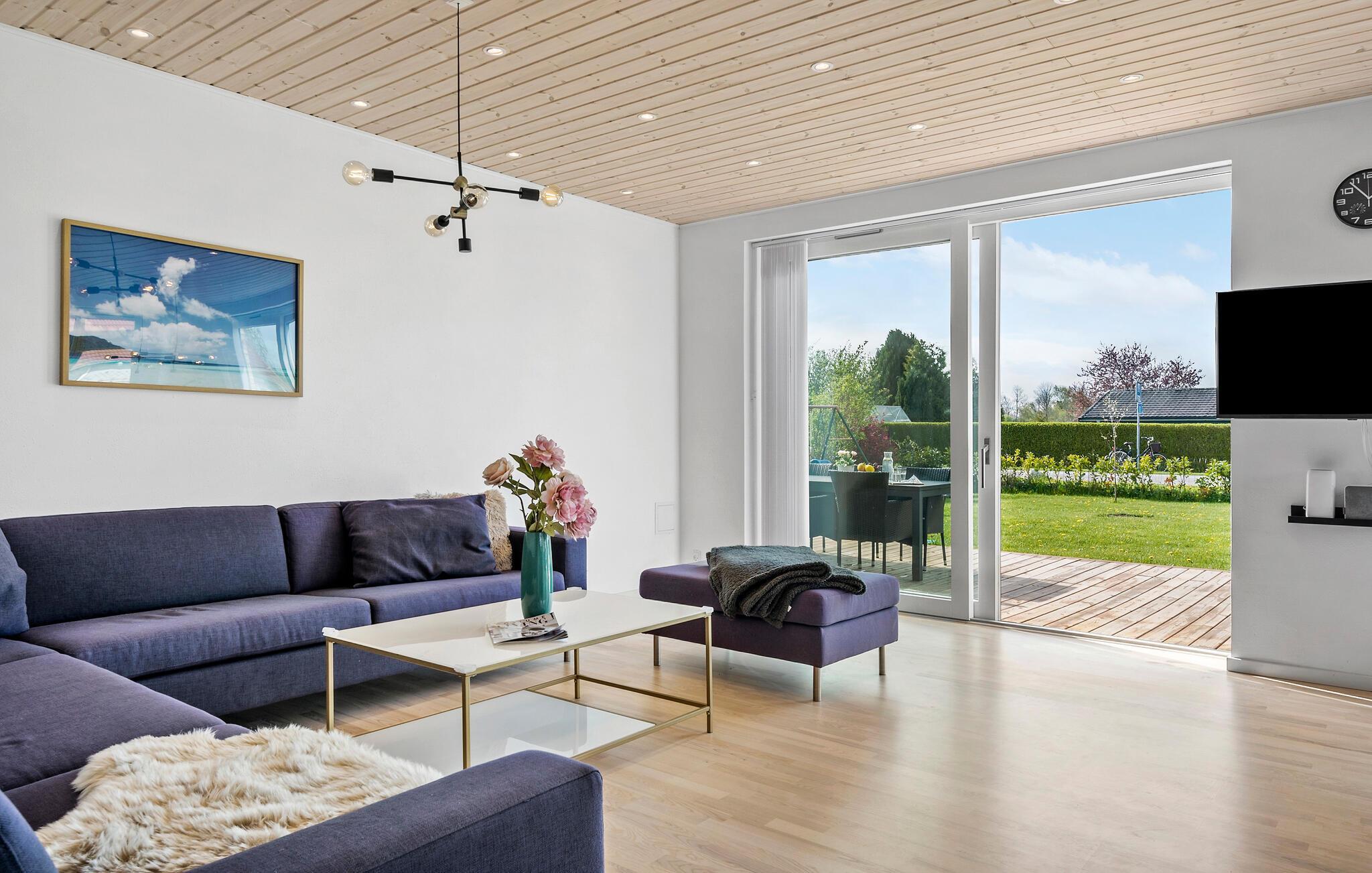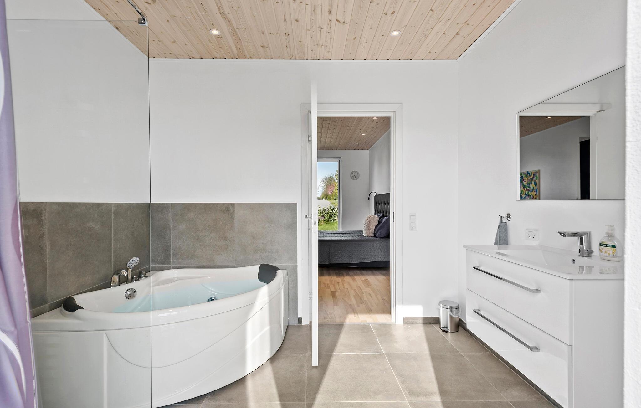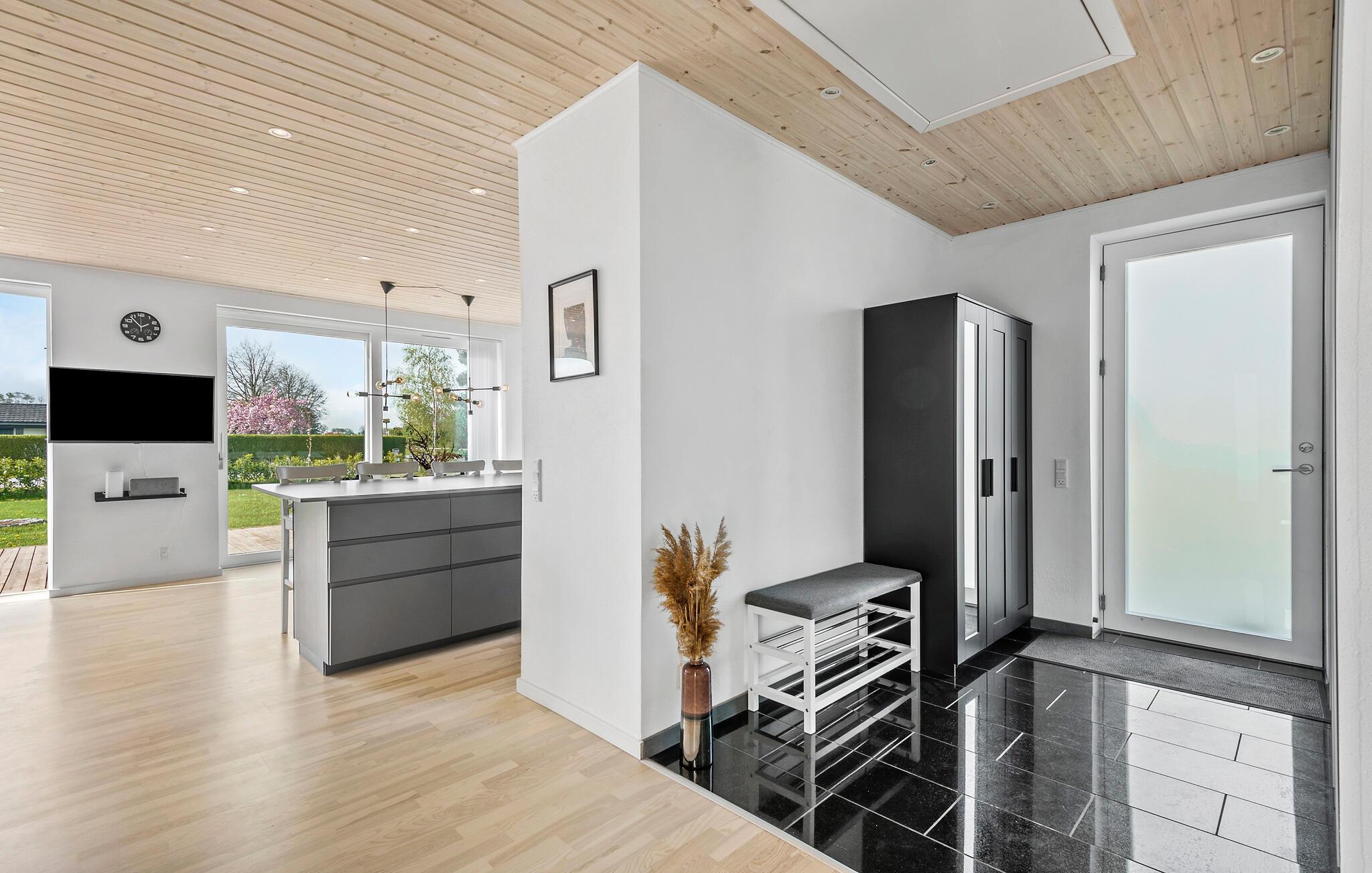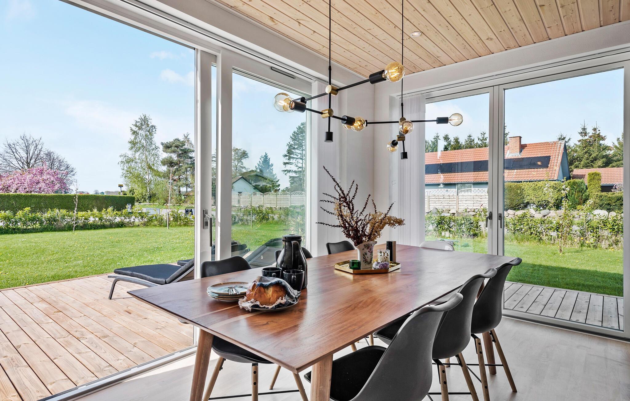 Dette hyggelige hus giver jer hjemlig komfort og muligheden for at tilbringe en afslappende familieferie. Begynd dagene med fælles morgenmad ved spisebordet. Store vinduer giver masser af dagslys og tilbyder et frit udsyn til den grønne have. Det åbne, moderne køkken lægger op til at lave mad og tilbringe tid sammen. Læn jer tilbage i den rummelige sofa i opholdsstuen og nyd en god film om aftenen. Et særligt højdepunkt ved huset er spabadet, som giver jer mulighed for at slappe af når som helst, hvad enten det er efter en gåtur på stranden eller bare midt imellem.