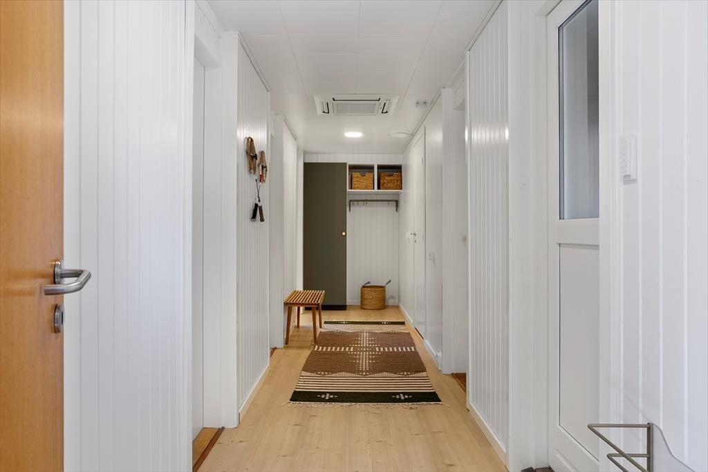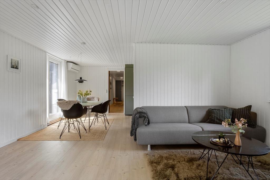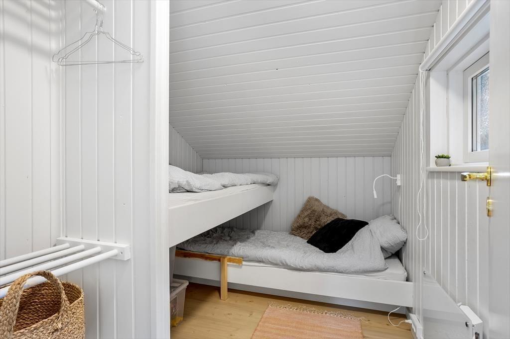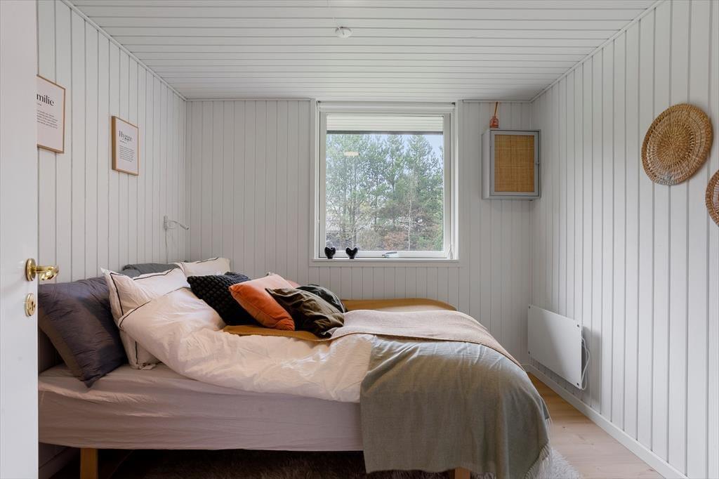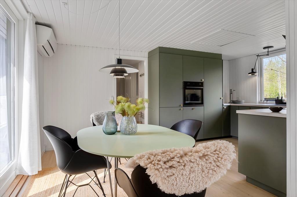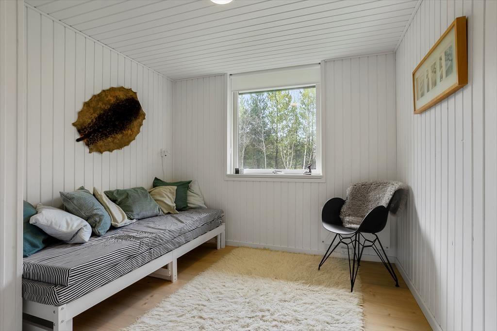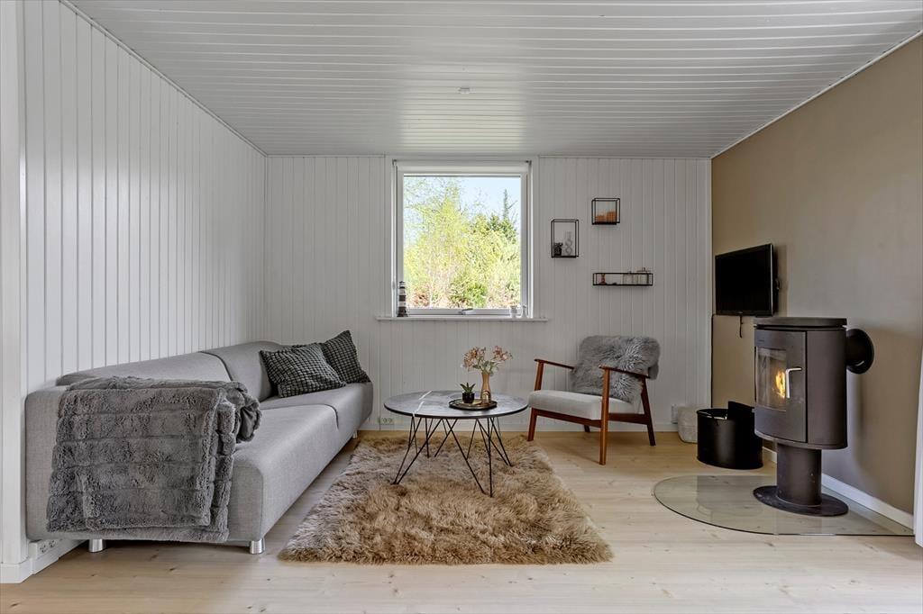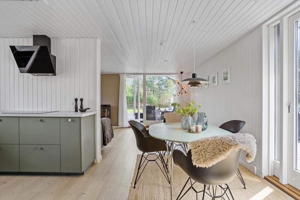 Når du træder indenfor i dette skønne sommerhus, er det første, der møder dig, en lys og imødekommende atmosfære. Huset er nyrenoveret med respekt for det klassiske sommerhusliv, og de lyse overflader, store vinduespartier og venlige farver giver en følelse af luft, rummelighed og nærhed til naturen. Den åbne stue byder på et hyggeligt sofaområde, hvor du kan synke ned med et tæppe og en god bog, mens brændeovnens knitren varmer stuen op og skaber en afslappet stemning. Køkkenet ligger i åben forbindelse med stuen, så hele familien kan være sammen, selv når der skal laves mad – og ved spisebordet er der plads til lange måltider og gode feriesnakke. Sovepladserne er fordelt på værelser, der inviterer til god nattesøvn og afslapning efter en dag fyldt med oplevelser, mens badeværelset er enkelt og funktionelt indrettet med alt, hvad I skal bruge i hverdagen.