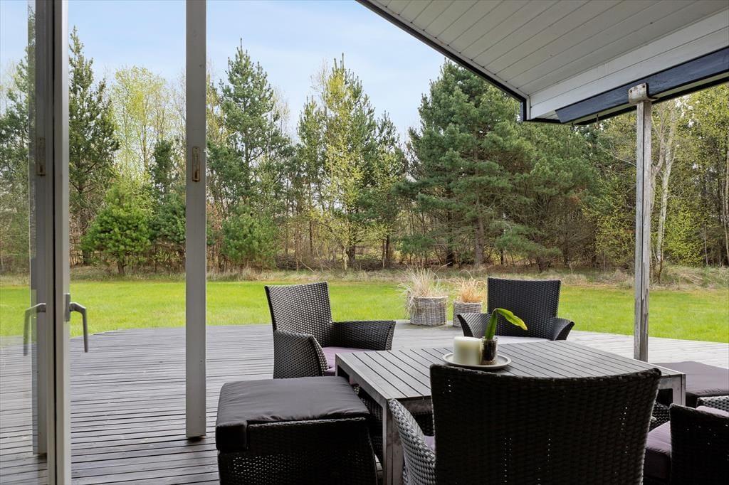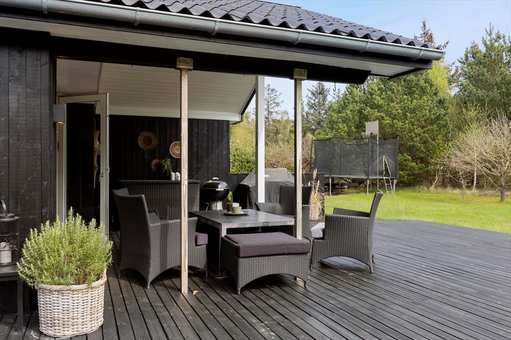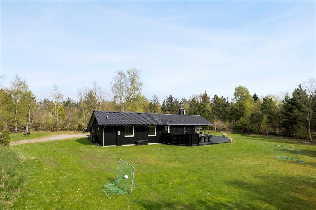 På den store og ugenerede naturgrund kan du nyde ferien i fuld frihed. Her er både plads og ro til at trække vejret dybt og lade feriefølelsen bundfælde sig. Terrassen breder sig rundt om huset, så du altid kan finde en solplet eller et sted i skyggen – uanset tidspunktet på dagen. På græsplænen er der masser af plads til leg og boldspil, og når mørket falder på, kan I samles omkring det hyggelige bålsted med snobrød, varme tæpper og stjerner på himlen. For børnene – og eventyrlystne sjæle – byder haven også på et shelter, hvor man kan sove under åben himmel og lytte til nattens lyde fra skov og strand. Her får I med andre ord ikke bare et sommerhus, men en hel ferieoase under åben himmel – og det hele ligger trygt og godt omkranset af grøn bevoksning og fredelig natur.