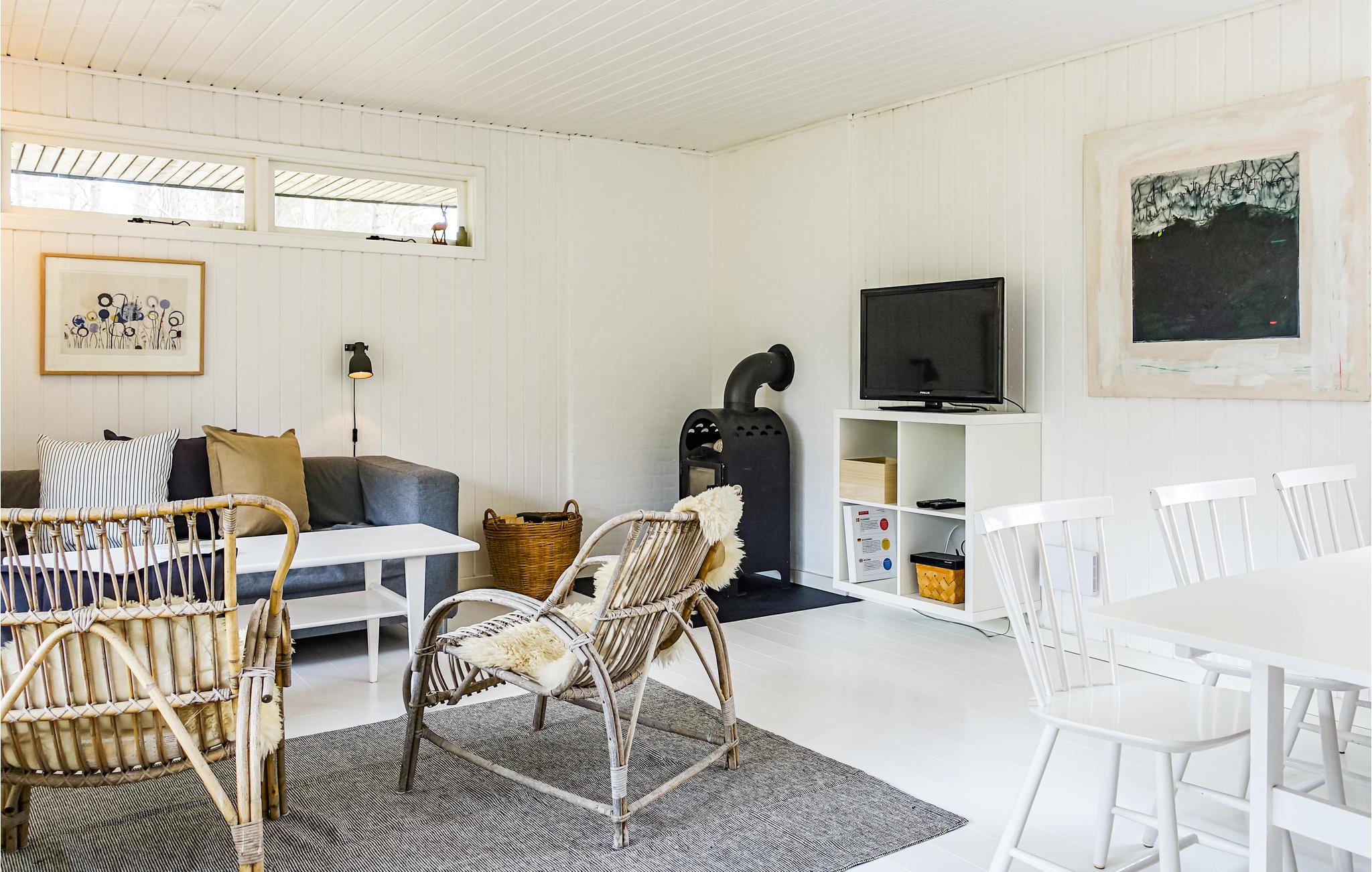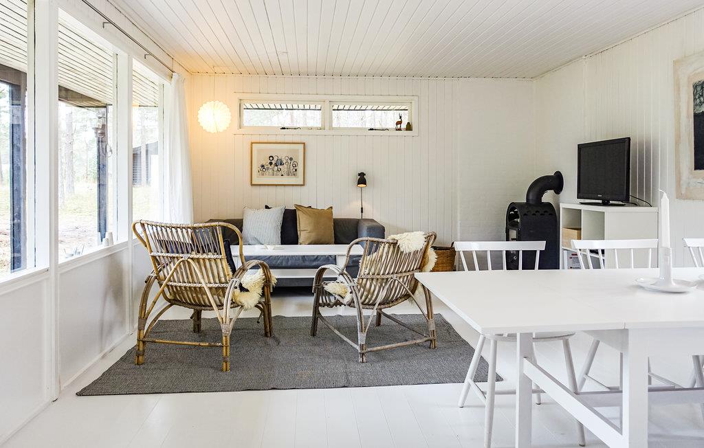 Velkommen til dette hyggelige og meget lyse sommerhus. I kommer primært til at opholde jer i den dejlige opholdsstue med TV, radio og brændeovn og store vinduer ud mod de grønne omgivelser.