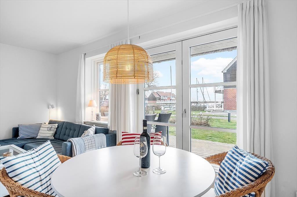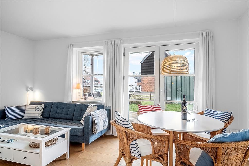 På den sydvendte terrasse med havemøbler, kan I nyde udsigten og de lune dage og aftner. Fra lejligheden har du skøn udsigt til marinaen og du er tæt på badestrand. Den gode beliggenhed gør, at på den ene side af lejligheden, kan du købe friske fisk, og på den anden side af lejligheden, kan du selv nyde din fisk på terrassen. Bag lejligheden ligger en legeplads hvor børnene kan hygge sig.