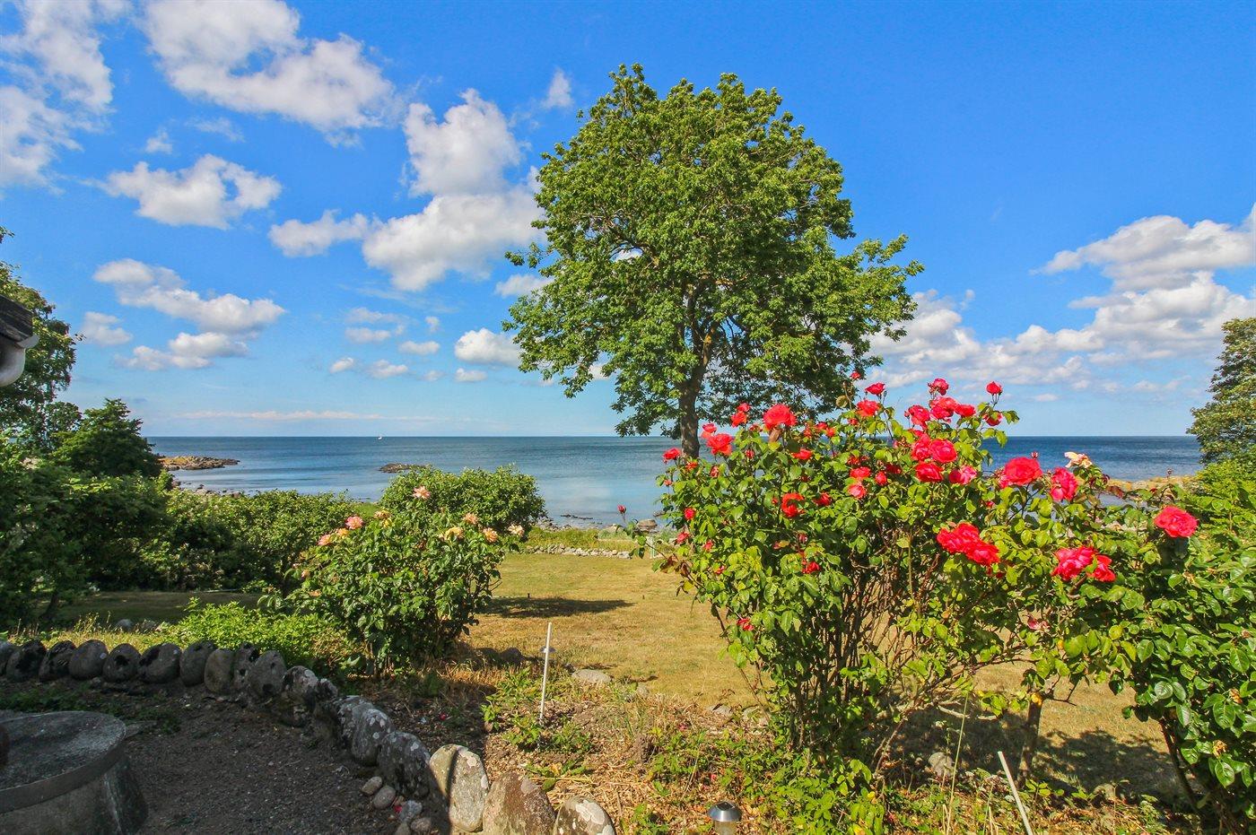 Et ældre og unikt beliggende sommerhus med stråtag - direkte ned til kysten med adgang til klipper og havet fra den store del af haven, der skråner ned mod vandet.