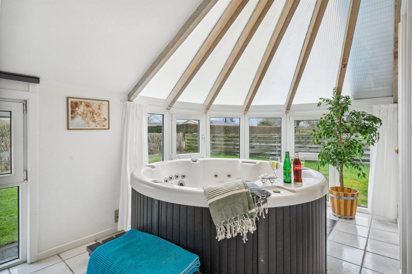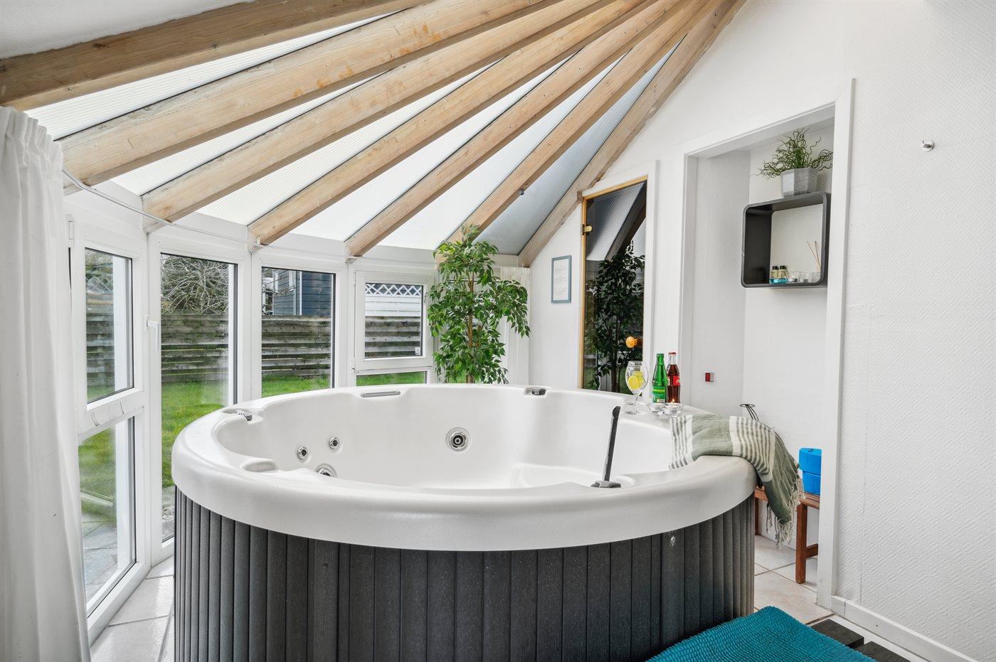 Et charmerende sommerhus med stor spa og sauna, beliggende på en stor havegrund - kun 100 m fra dejlig børnevenlig badestrand.