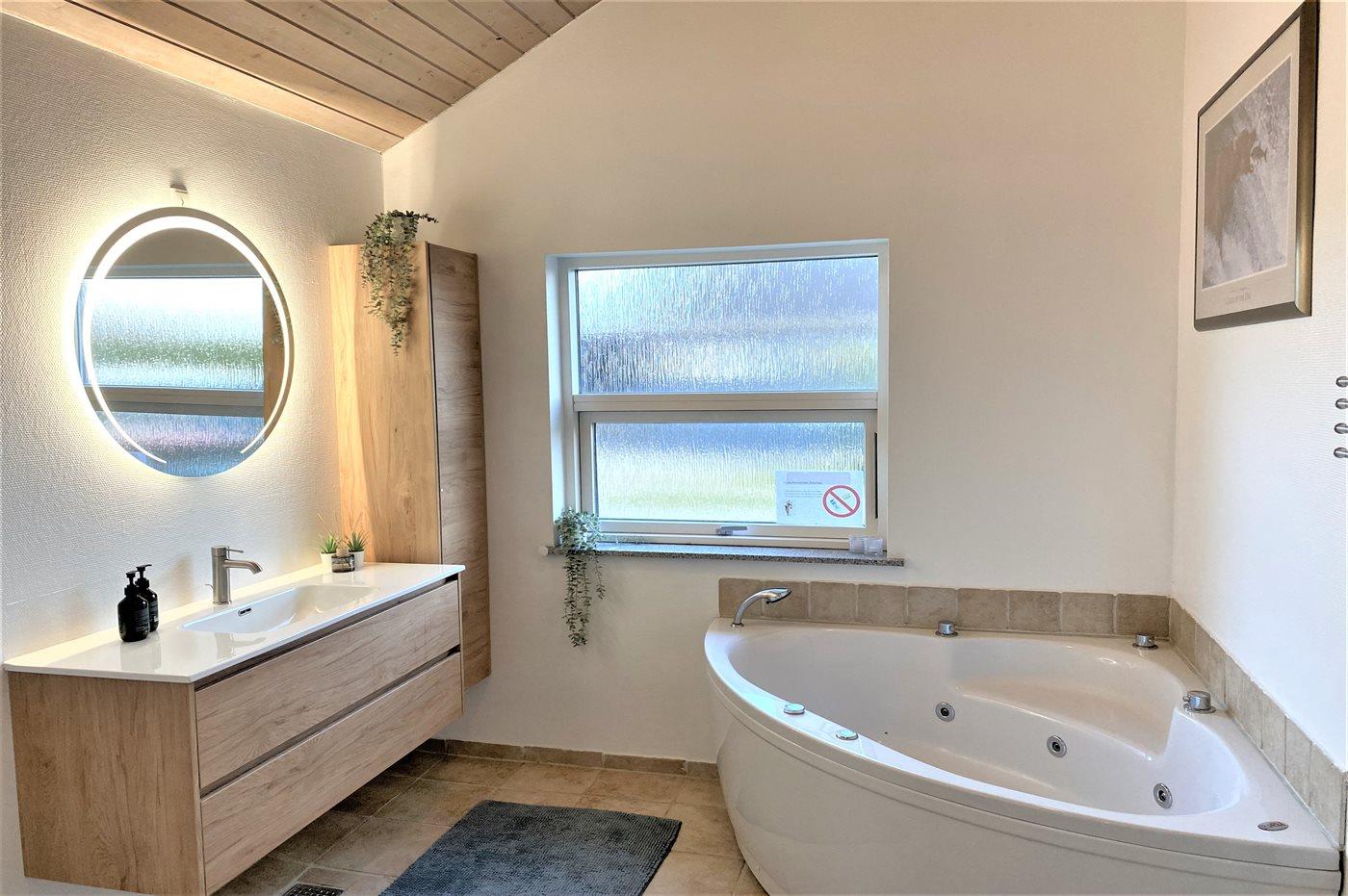 Huset er lyst og rummeligt - og blandt de få i området, som tilbyder 4 soveværelser - alle med dobbeltsenge og skabsplads. Det ene værelse er beliggende i annekset med eget toilet og bryggers - blot et enkelt skridt fra hovedhuset. Husets store badeværelse indeholder bruser samt et 2 personers spabad. På husets hems findes en fin hyggeafdeling med stor fladskærm, FATBOY sækkestole og mulighed for at opkoble egen Nintendo, etc. Husets stue, hvorfra der er udgang til den syd-/vestvendte terrasse, ligger i forbindelse med spiseafdelingen og det åbne køkken. Møblerne er moderne og behagelige. I stuen er yderligere indrettet en lille alkove, hvorfra det er muligt at arbejde - eller ungerne kan sidde og tegne. I stuen findes endnu et stort smart TV med danske, nordiske og tyske tv-kanaler, Harman Kardon bluetooth højttaler og pejs. Huset har lynhurtigt fibernet, og er desuden udstyret med varmepumpe/aircondition, således at det kan bruges året rundt. Der er terrasser/hyggekroge mod vest, øst og syd/vest. Huset er moderniseret i efteråret 2020.
