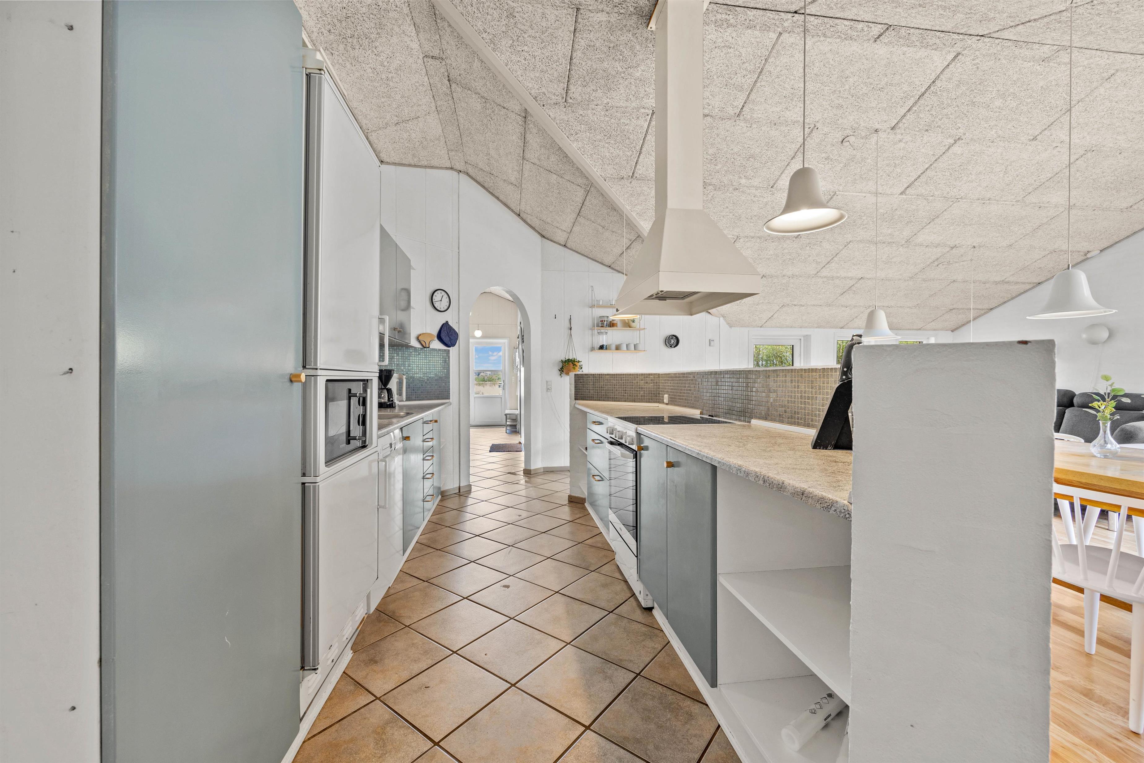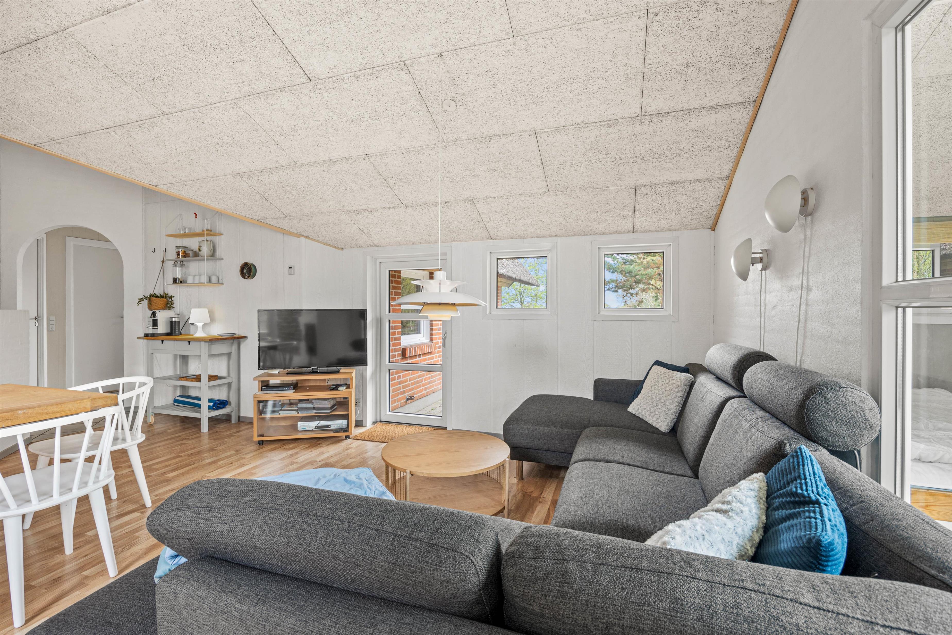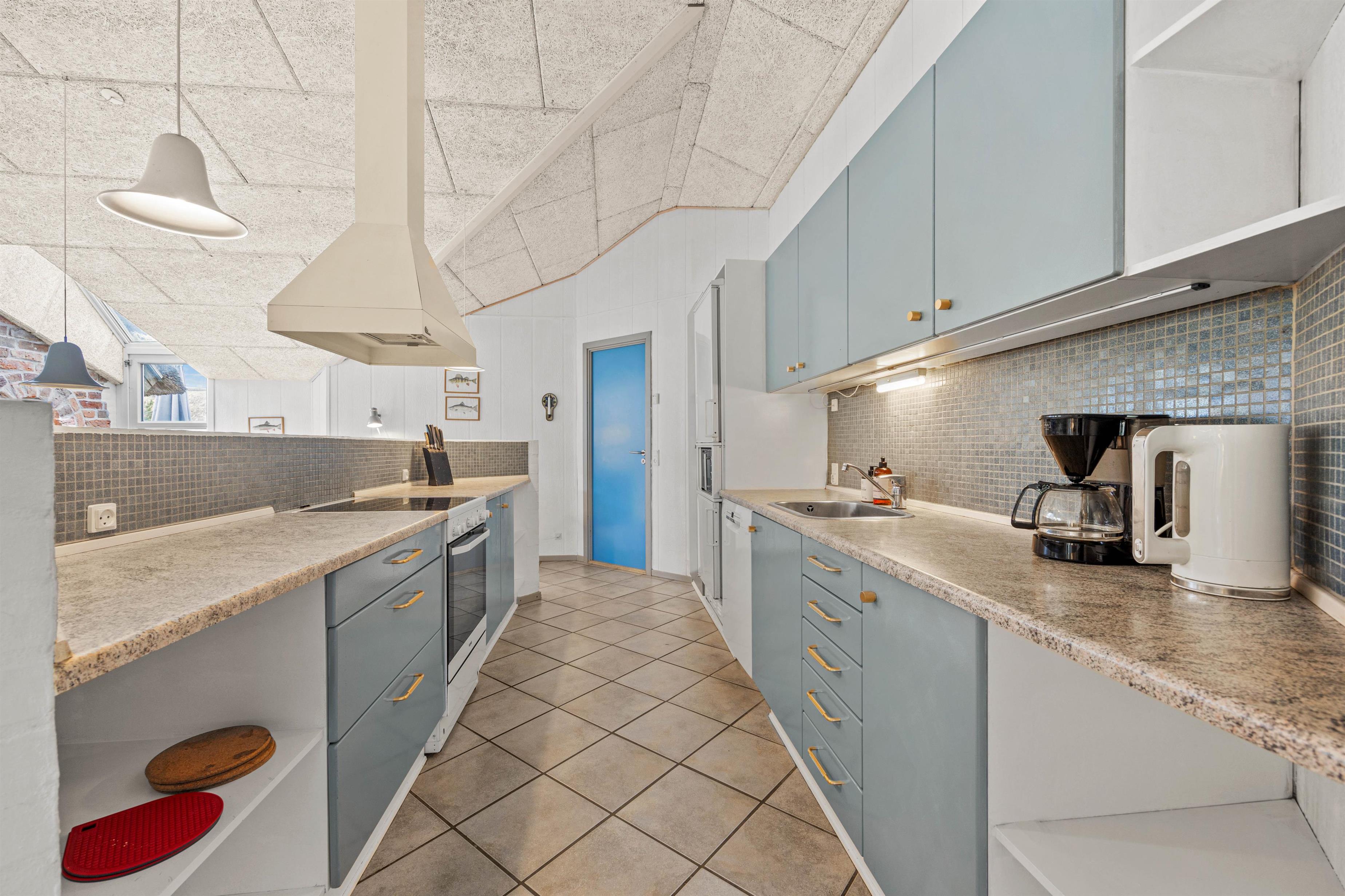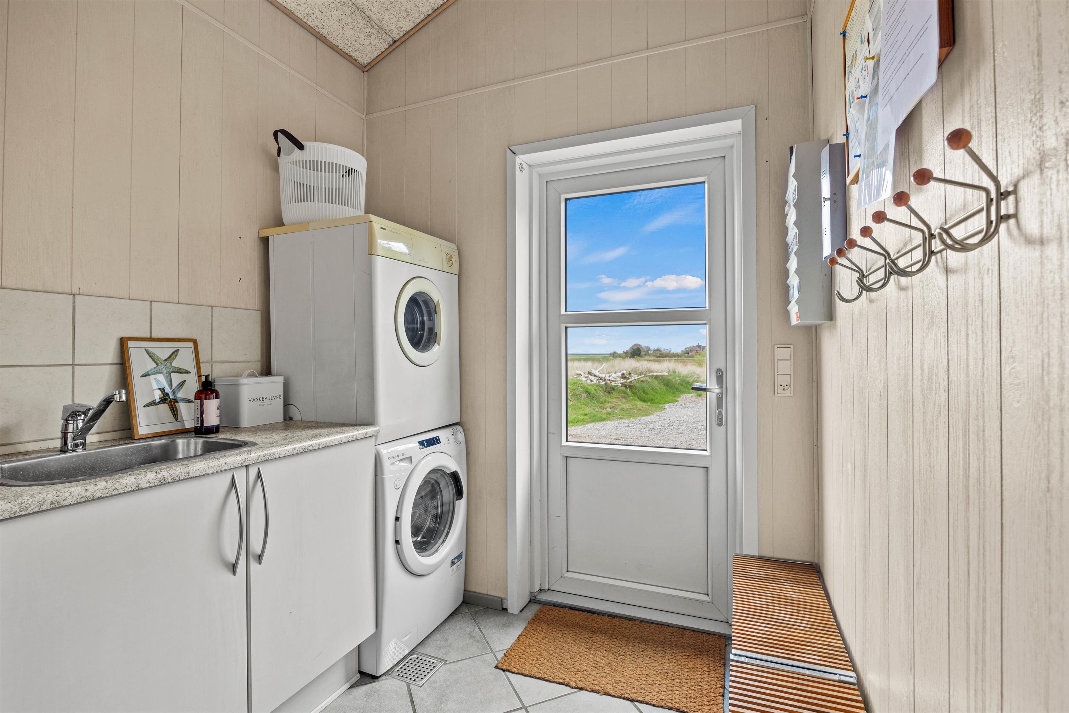 Når hele flokkens skal samles, kan det eksempelvis være i det store køkkenalrum, der forener stue, køkken og en skøn udestue. Her er rigeligt med siddepladser og loft til kip, hvilket skaber en rummelig og rar atmosfære. I det veludstyrede køkken kan laves lækker mad, mens børnene tegner omkring spisebordet. Efter mad klarer opvaskemaskine naturligvis oprydningen for jer! Feriehuset har alle hverdagens bekvemmeligheder såsom vaskemaskine og tørretumbler, der sørger for friske håndklæder.