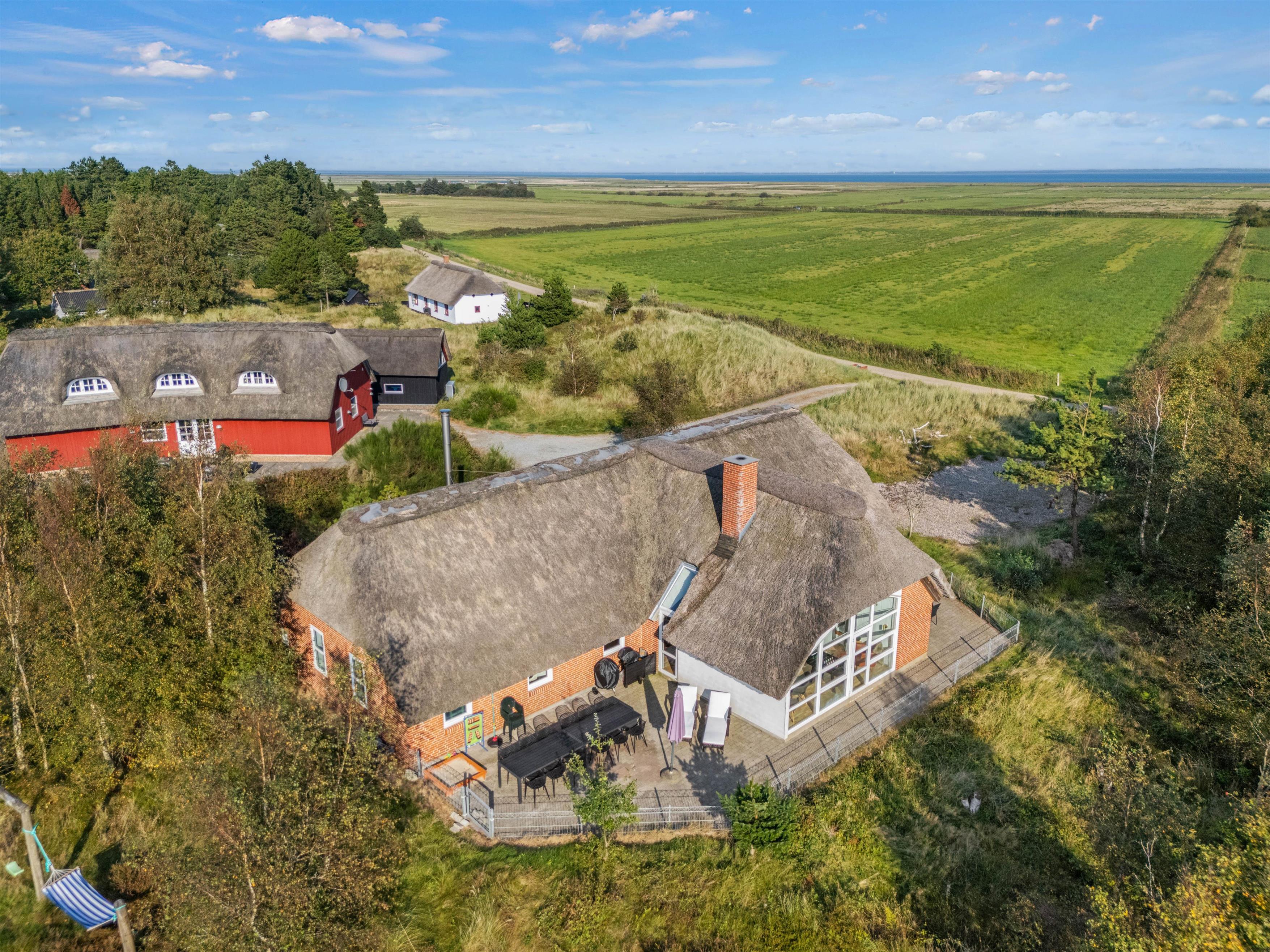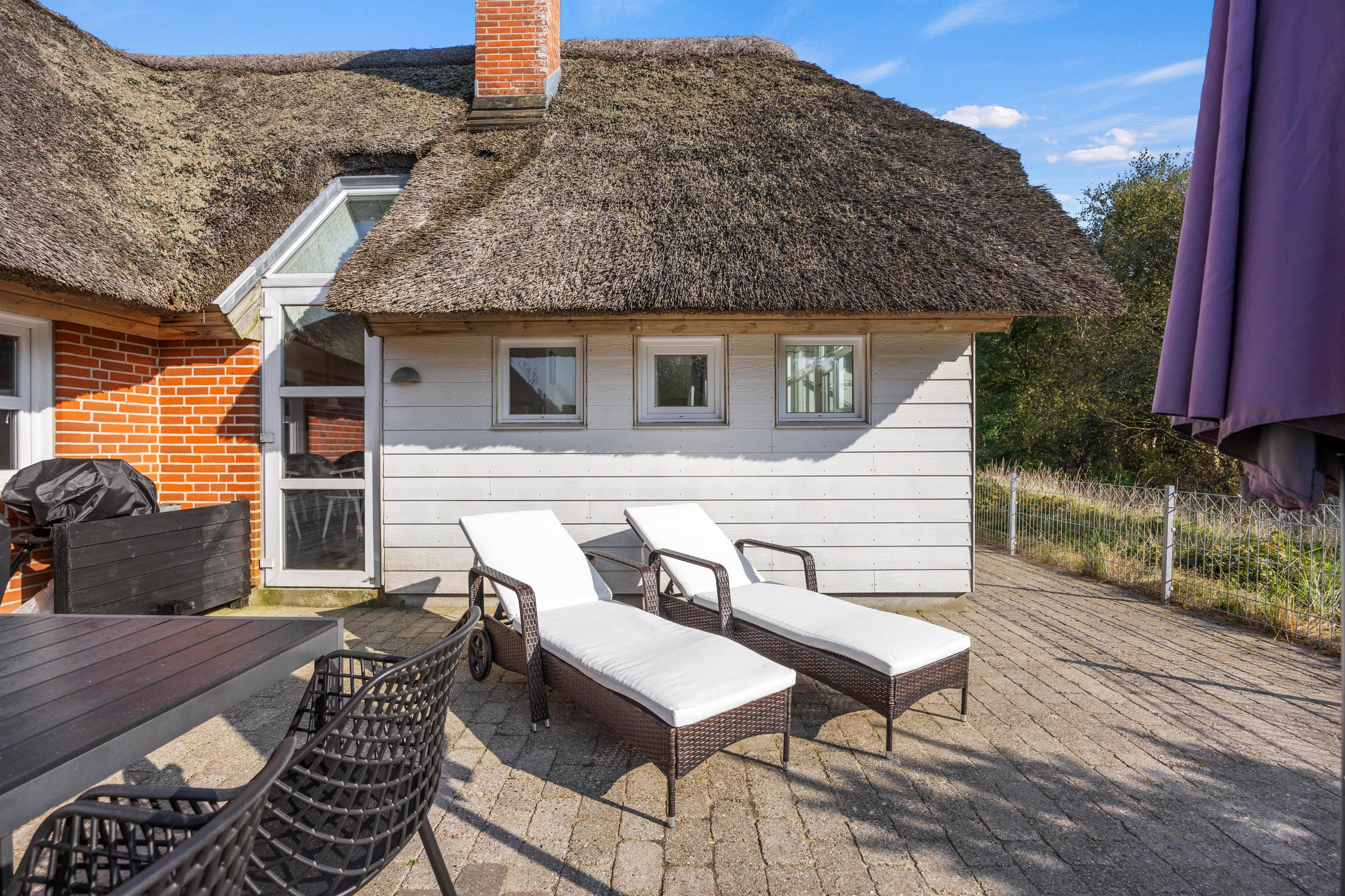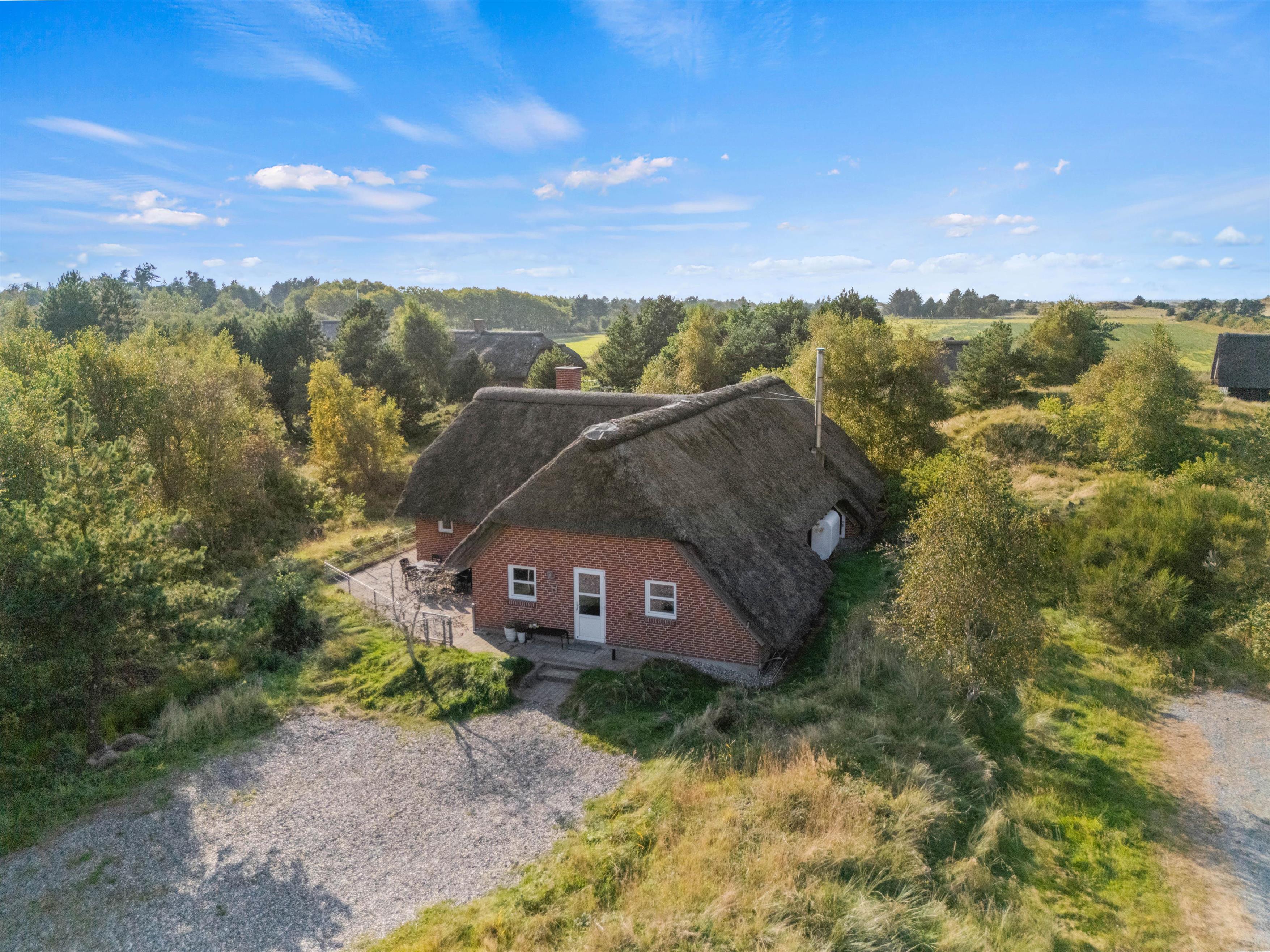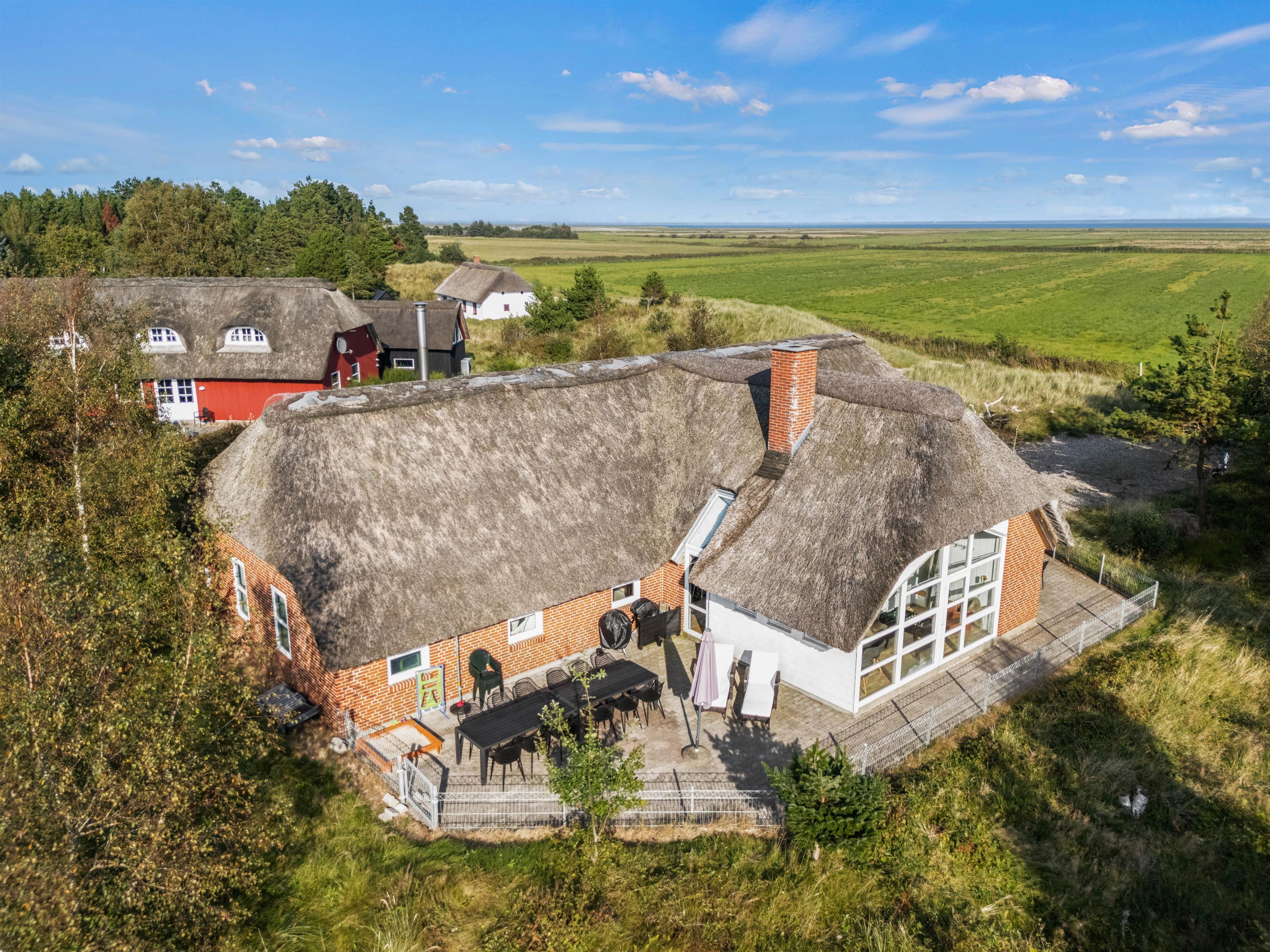 Et superhyggeligt sommerhus med stråtag og masser af plads. Beliggende på en stor naturgrund ligger feriehuset på hele 203 m2. Her er plads til 12 feriegæster og 1 hund. Planløsninger byder blandt andet på 2 badeværelser med gulvvarme, 6 gode værelser samt 1 hyggelige alkove, der også kan anvendes som soveplads. Tre af værelserne er indrettet med dobbeltsenge, 160x200, to er indrettet med en trekvart seng, 140x200, og det sjette er udstyret med to enkeltsenge, 80x200. Her kan I sove trygt og få en god nattesøvn, så I er friske til morgendagens aktiviteter og badning.
