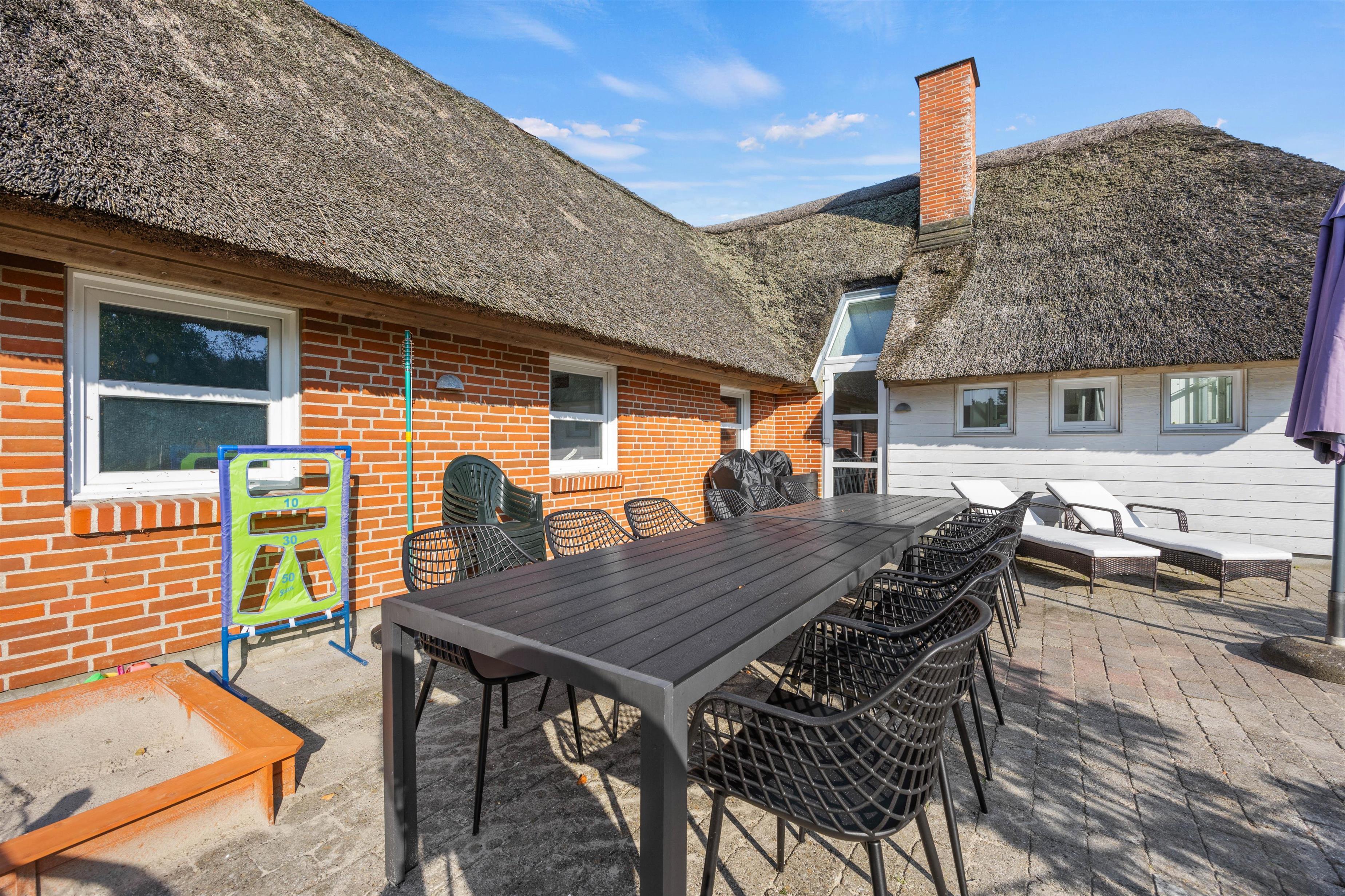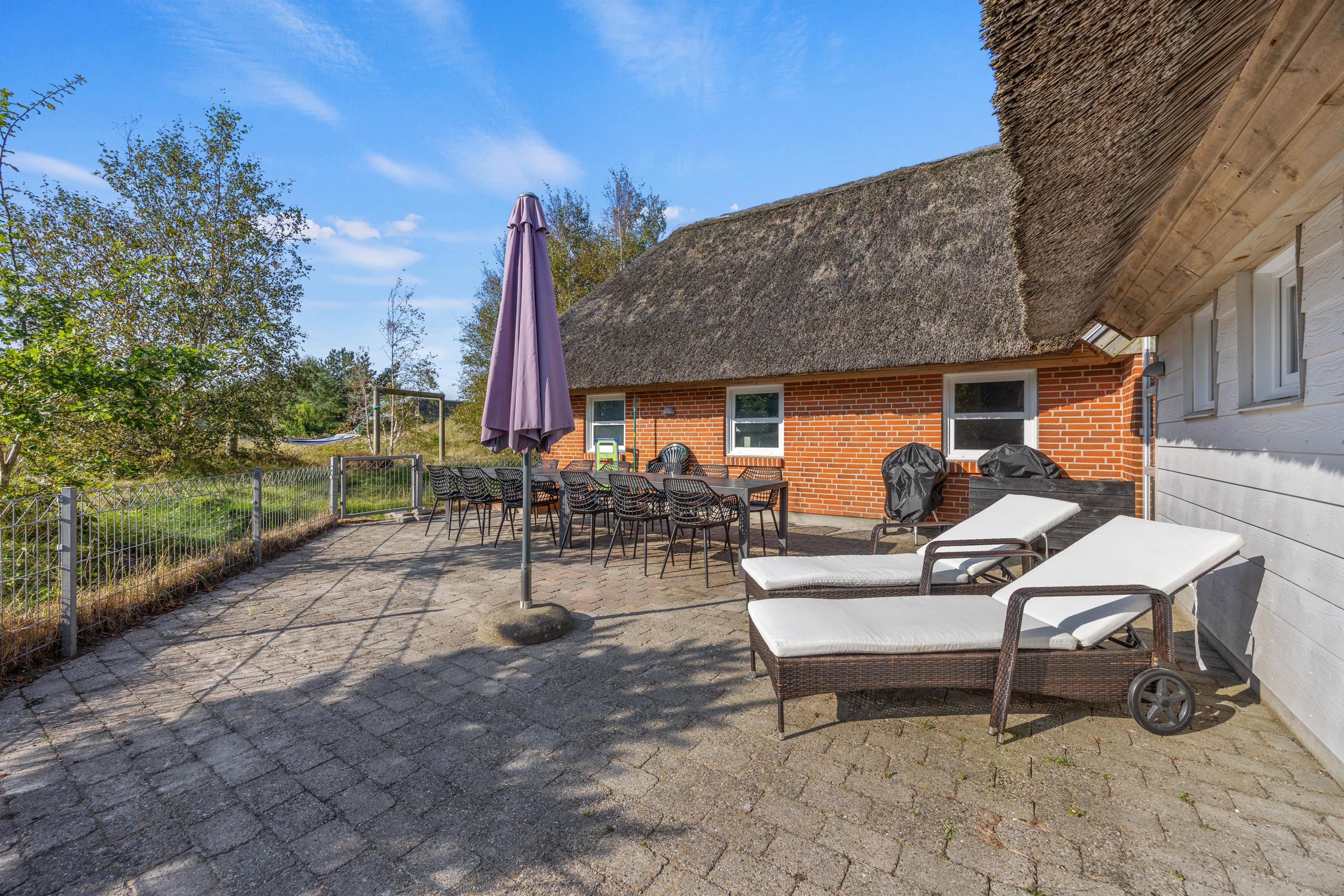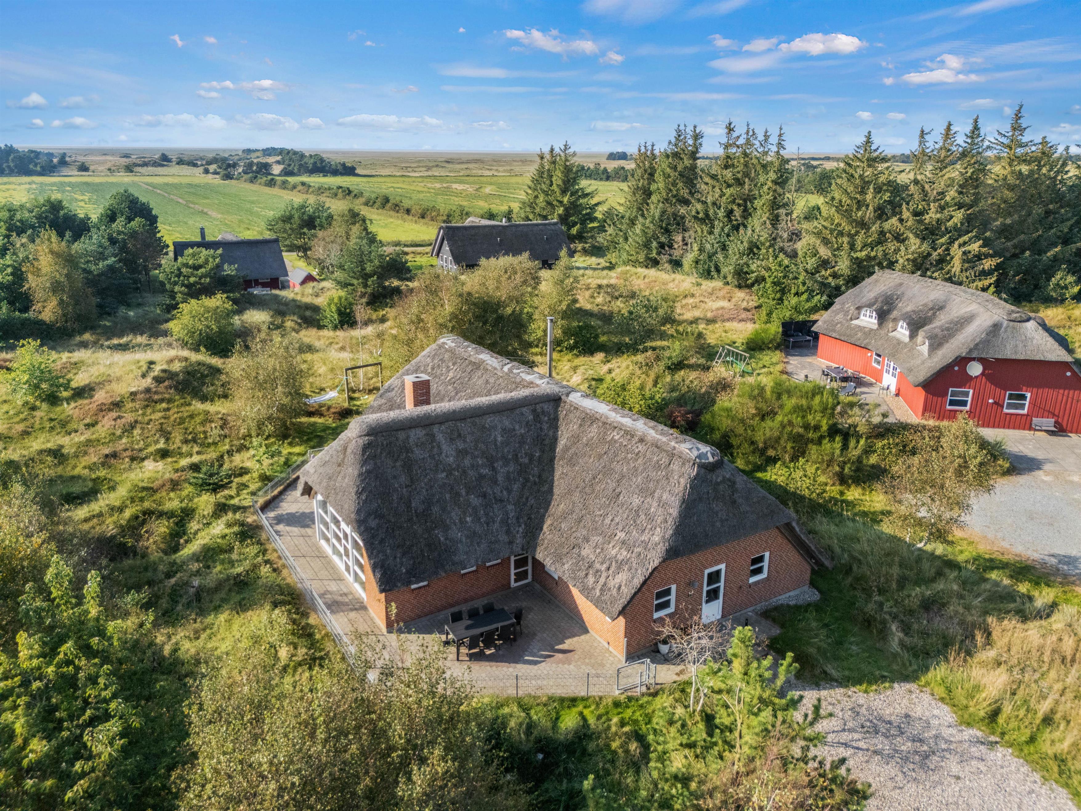 Et superhyggeligt sommerhus med stråtag og masser af plads. Beliggende på en stor naturgrund ligger feriehuset på hele 203 m2. Her er plads til 12 feriegæster og 1 hund. Planløsninger byder blandt andet på 2 badeværelser med gulvvarme, 6 gode værelser samt 1 hyggelige alkove, der også kan anvendes som soveplads. Tre af værelserne er indrettet med dobbeltsenge, 160x200, to er indrettet med en trekvart seng, 140x200, og det sjette er udstyret med to enkeltsenge, 80x200. Her kan I sove trygt og få en god nattesøvn, så I er friske til morgendagens aktiviteter og badning.