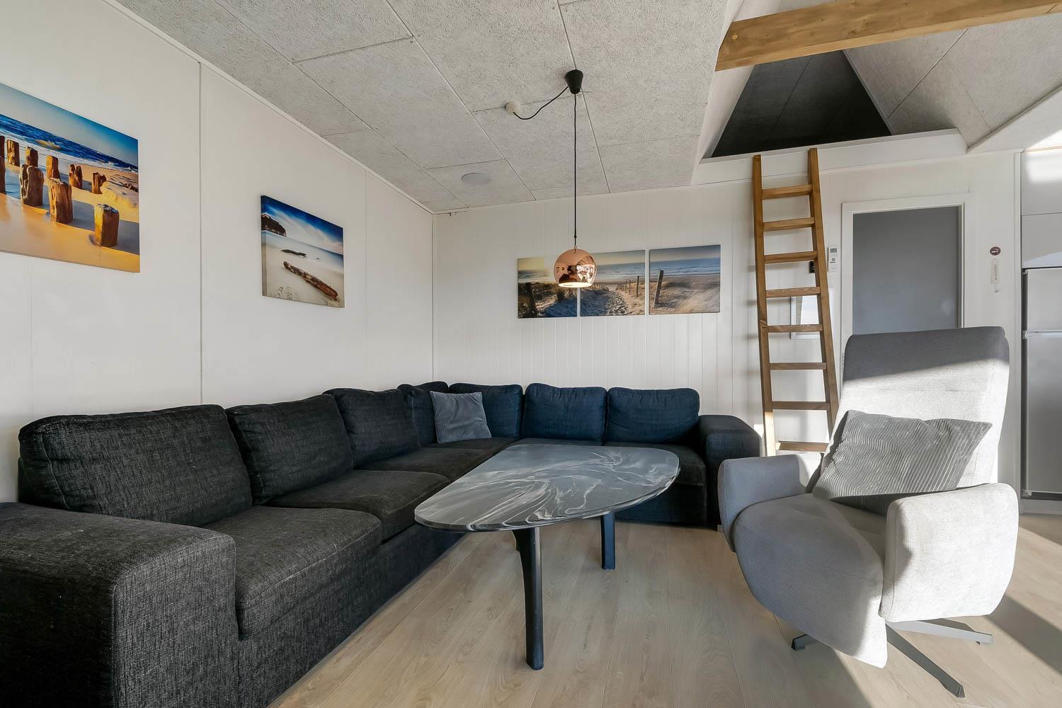 Huset er lyst og venligt indrettet med komfortable lædermøbler, brændeovn som giver en behagelig varme også på de kolde dage samt TV med danske og tyske programmer. Der er lyse trægulve i stue og køkkenafdelingen. Åben køkken som er indrettet med elkomfur, emhætte, opvaskemaskine og mikroovn. Badeværelse med bruser, toilet, håndvask. 3 soverum med 1DB + 1DB og 1 køjeseng. Der er trægulve i soverummene. Der er også en vaskemaskine i huset. Fra stue og køkkenet er der en fantastisk udsigt til Vesterhavet og fællesarealet med legeplads og bålplads ligger lige udenfor døren. Der er gratis internetadgang. 2 husdyr er tilladt. Rygning er ikke tilladt.