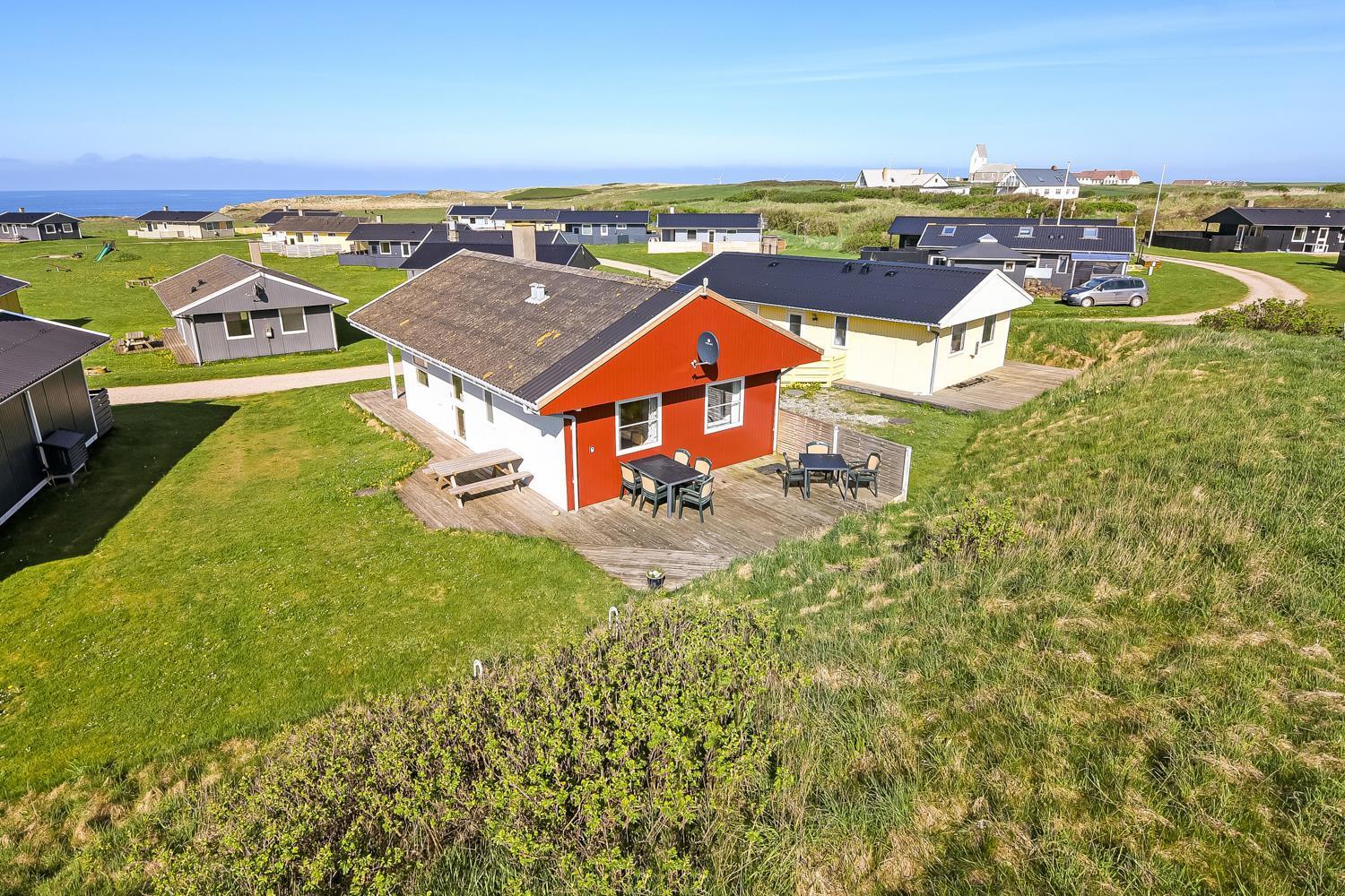 56 m2 træferiehus med 2 soveværelser (1DS, 1DS). Kombineret opholdsstue og køkkenhjørne. Lige på den anden side af køkkenhjørnet er spisebordet placeret. Herudover er der tv med danske og tyske kanaler samt mulighed for streaming af TV / radio / Apps. Opholdsstuen med lædermøbler og en varmepumpe som altid sørger for god varme en billig pris. Pænt køkkenhjørne med keramiske kogeplader, inbygningsovn, emhætte, køleskab med lille fryseboks, mikroovn, opvaskemaskine og udgang til terrasse. Pænt badeværelse med toilet, bruser, håndvask og klinkegulv med gulvvarme. Fra stuen er er kig til Vesterhavet. barnestol. Ikke ryger hus. Max 1. Husdyr tilladt.