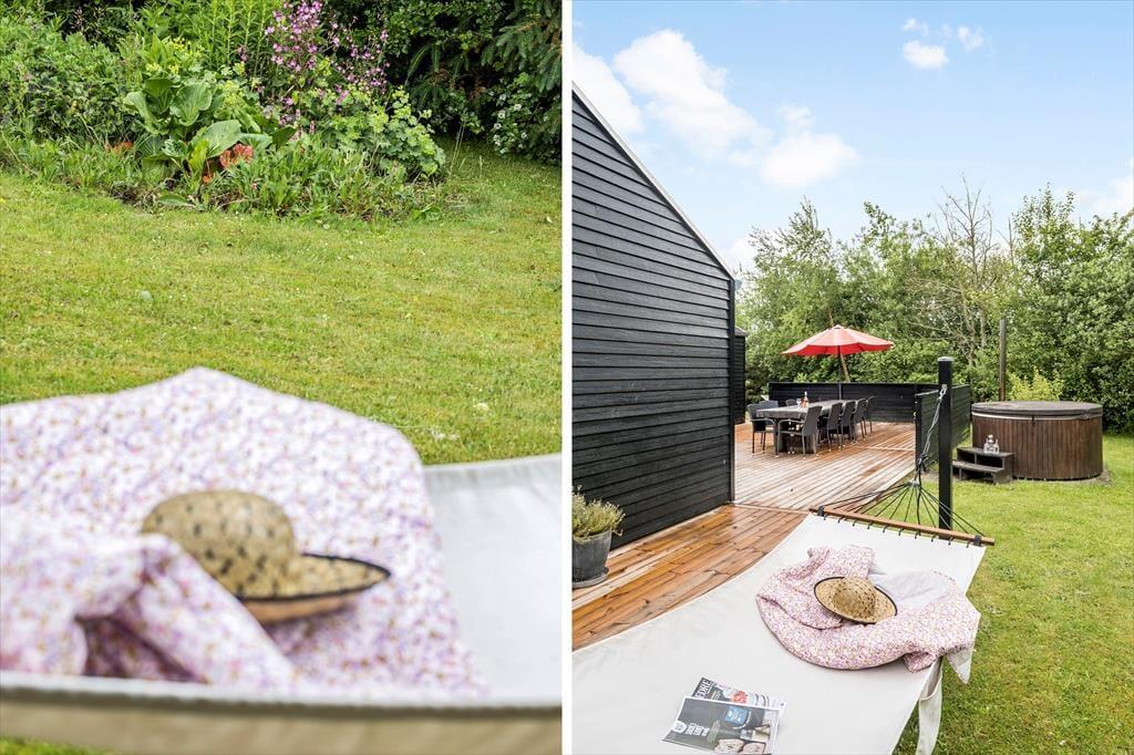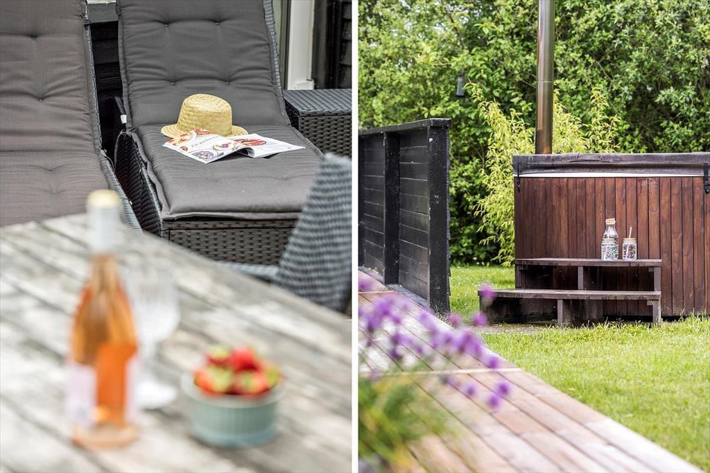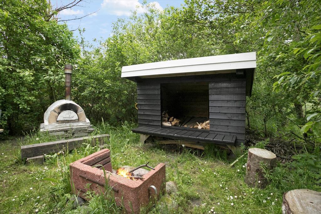 Afslapningsstunderne kan også foregå ude i det fri på den 1.826 m2 store og komplet ugenerede grund og terrasse. Den er for øvrigt helt aflukket, hvilket er perfekt, hvis I medbringer husdyr på ferien. Har I børn med, eller kan I bare selv lide at lege og dyrke sport, er det skønt at kunne boltre sig på feriebyens store fællesområde – men det er nu også rart at blive her på matriklen, hvor I kan sole jer på terrassen, nyde livet i vildmarksbadet og overnatte ude i det fri i shelteret.