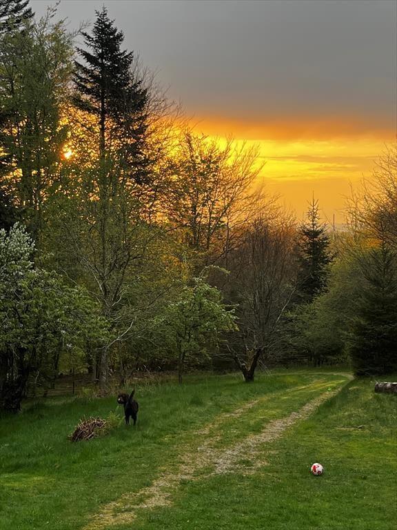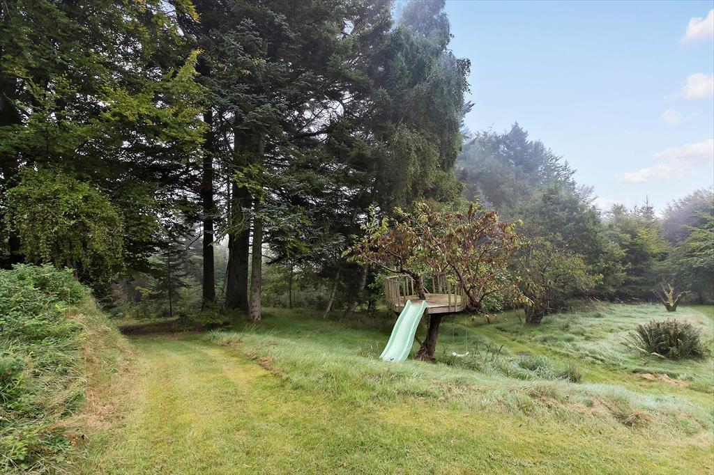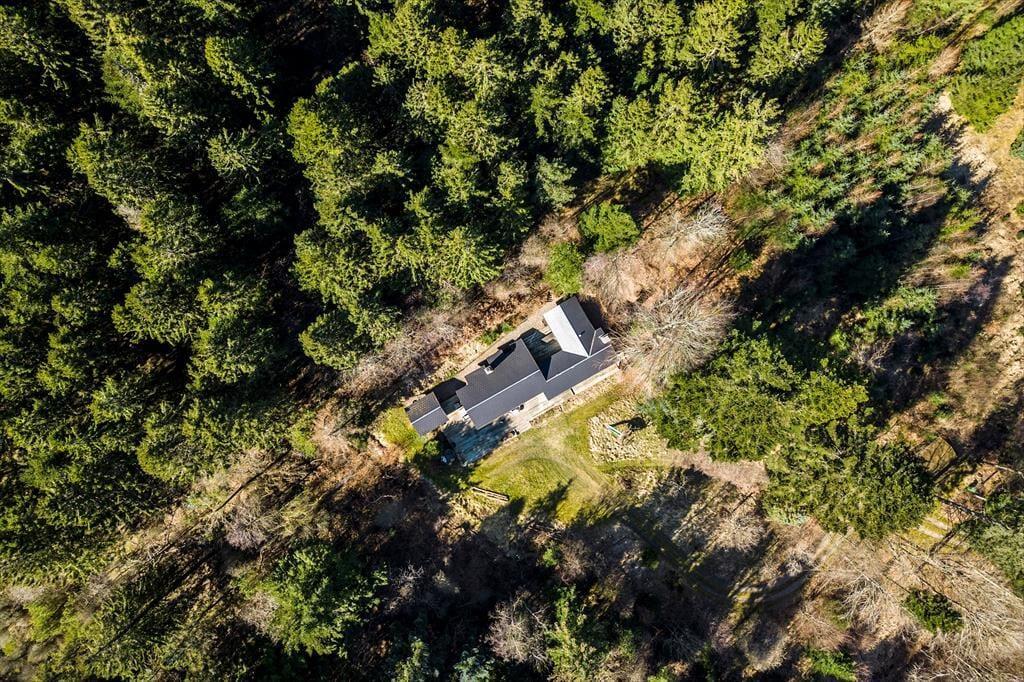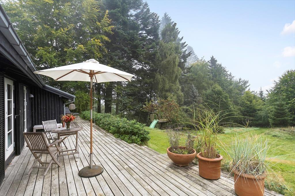 Sommerhuset ligger helt ugeneret i "skovens dybe stille ro" på kanten af Langdal Plantage. Grunden er kuperet og beliggende for enden af en forholdsvis stejl skovvej, hvilket giver en unik følelse af fred og privatliv. Fra terrassen kan du høre fuglene synge og måske spotte et rådyr, der bevæger sig gennem skoven – naturen er lige uden for døren.