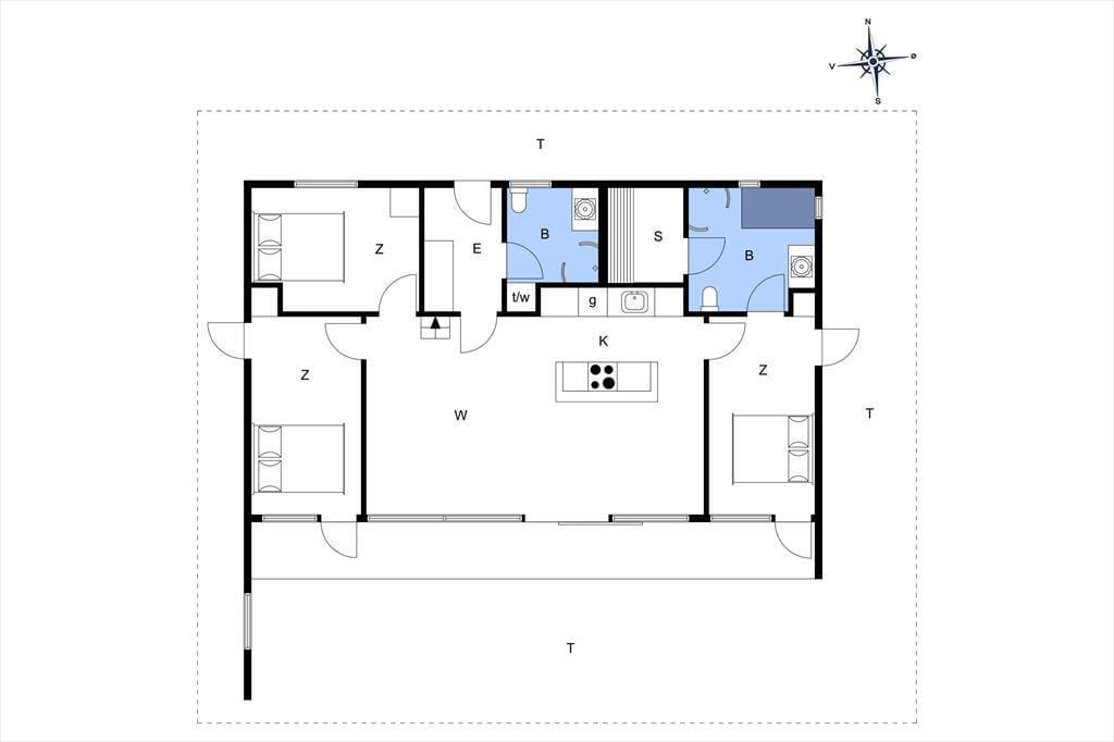 Sommerhusets store terrasseareal breder sig hele vejen rundt om sommerhuset, så det er nemt at finde en passende opholdsplads, hvis du får lyst til at sidde i en solstråle. Mod syd er en del af terrassen overdækket, og afskærmningen sørger for læ, hvis det skulle blæse fra vest. Grunden er komplet indhegnet, hvilket giver tryghed og frihed – især for børnefamilier og hundefamilier, der gerne vil kunne lade både børn og firbenede venner lege frit uden bekymringer. Grundens græsplæne er så stor, at den sagtens kan danne rammen om havespil og diverse lege – og hvis børnene synes, at de har brug for mere plads at boltre sig på, kommer I hurtigt fra den lukkede vej og frem til Tranum Feriebys fantastiske fællesareal, der byder på legepladser, boldbaner og meget mere.