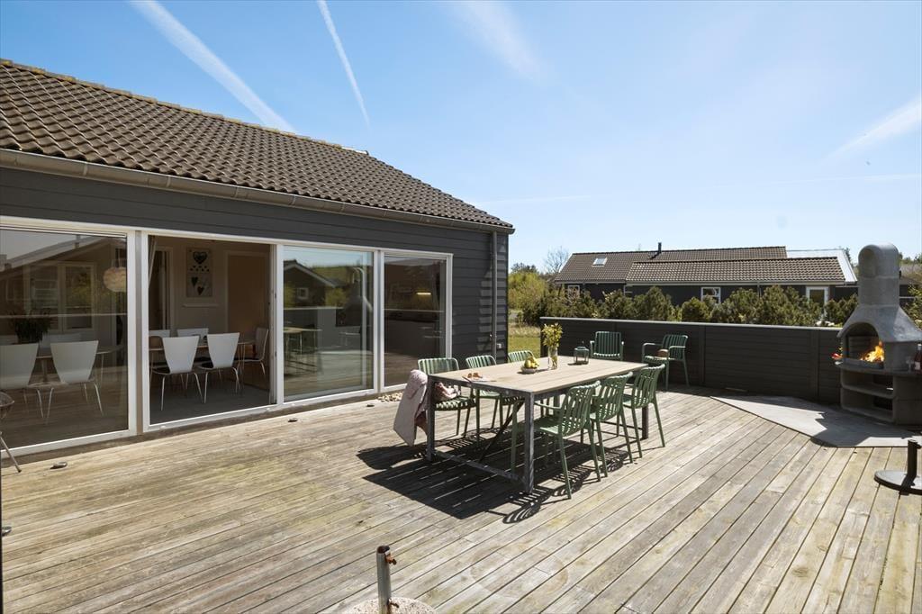 Terrassen, der har direkte adgang fra stuen, er det perfekte sted at nyde ferien under åben himmel. Her er der god læ, så du kan slappe af med en kop kaffe eller en god bog, uanset vejret. Terrassen er udstyret med komfortable havemøbler og giver mulighed for hyggelige grillmiddage i de lyse sommeraftener. Haven indbyder til leg og afslapning, og med den korte afstand til fællesarealet kan børnene trygt udforske området, mens de voksne finder ro på terrassen.