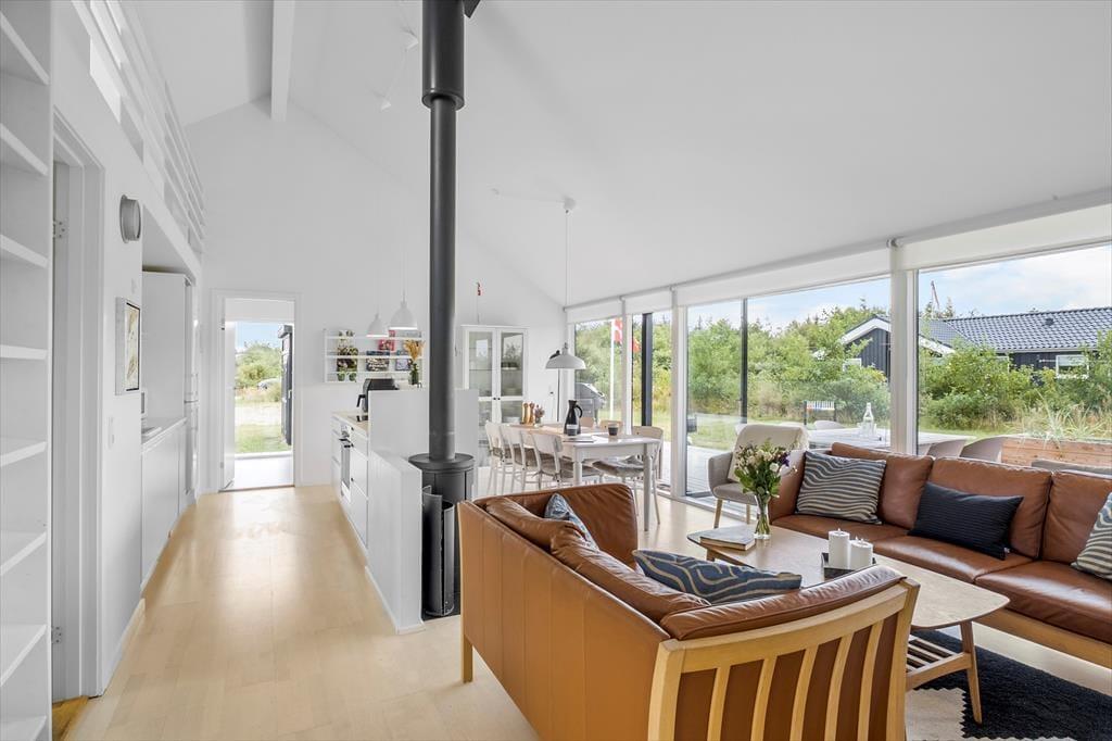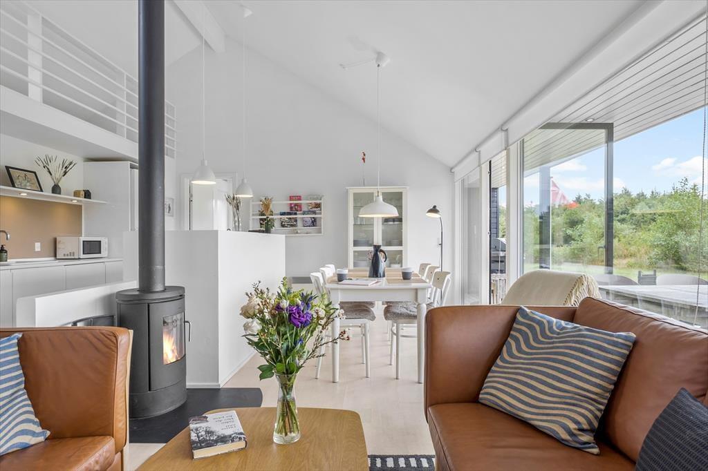Dette lyse og indbydende sommerhus i Tranum Ferieby danner de perfekte rammer for en afslappende ferie. Huset rummer tre soveværelser og to badeværelser, hvoraf det ene har både sauna og et lille spabad – oplagt til ren forkælelse efter en dag fuld af oplevelser. I den hyggelige stue sørger store vinduespartier for et dejligt lysindfald, og brændeovnen giver varme og atmosfære. Med både varmepumpe og brændeovn er huset oplagt til ferie hele året og alt forbrug er inkluderet i lejeprisen.