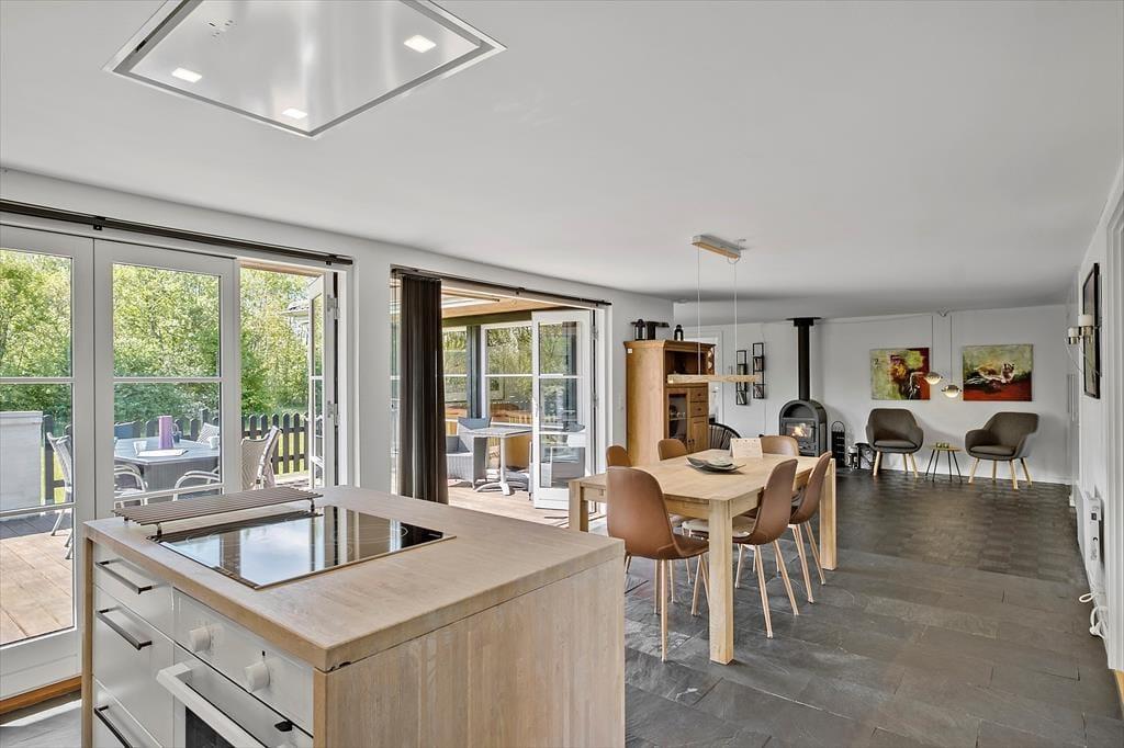 Husets 124 m2 byder på mange gode løsninger og er ideelt til børnefamilien eller to par som ønsker lidt kvalitetstid sammen. Samlingspunktet er det åbne køkken med spisestue og her kan de store vinduespartier, åbnes helt op til terrassen, så den danske sommer kan nydes i fulde drag. Køkkenet er veludstyret og har bl.a. amerikansk køleskab og fra kogeøen kan man samtidigt med madlavningen, følge med i familiens gøremål. De iøjnefaldende sorte gulve, som er henholdsvis skifer og sort lakerede trægulve, er gennemgående i hele huset og passer godt til møblerne og indretningen. Der er i alt tre soveværelser samt to badeværelser, og som ekstra luksus, er der desuden spabad og sauna som kan lade batterierne op efter en dejlig dag ved stranden, i naturen eller områdets mangle udendørs faciliteter.