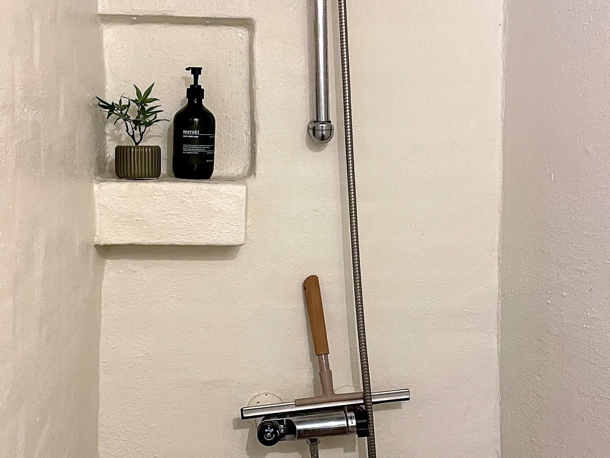 Nyt badeværelse med badekar, bruser og toilet, placeret på hver side af gangen.