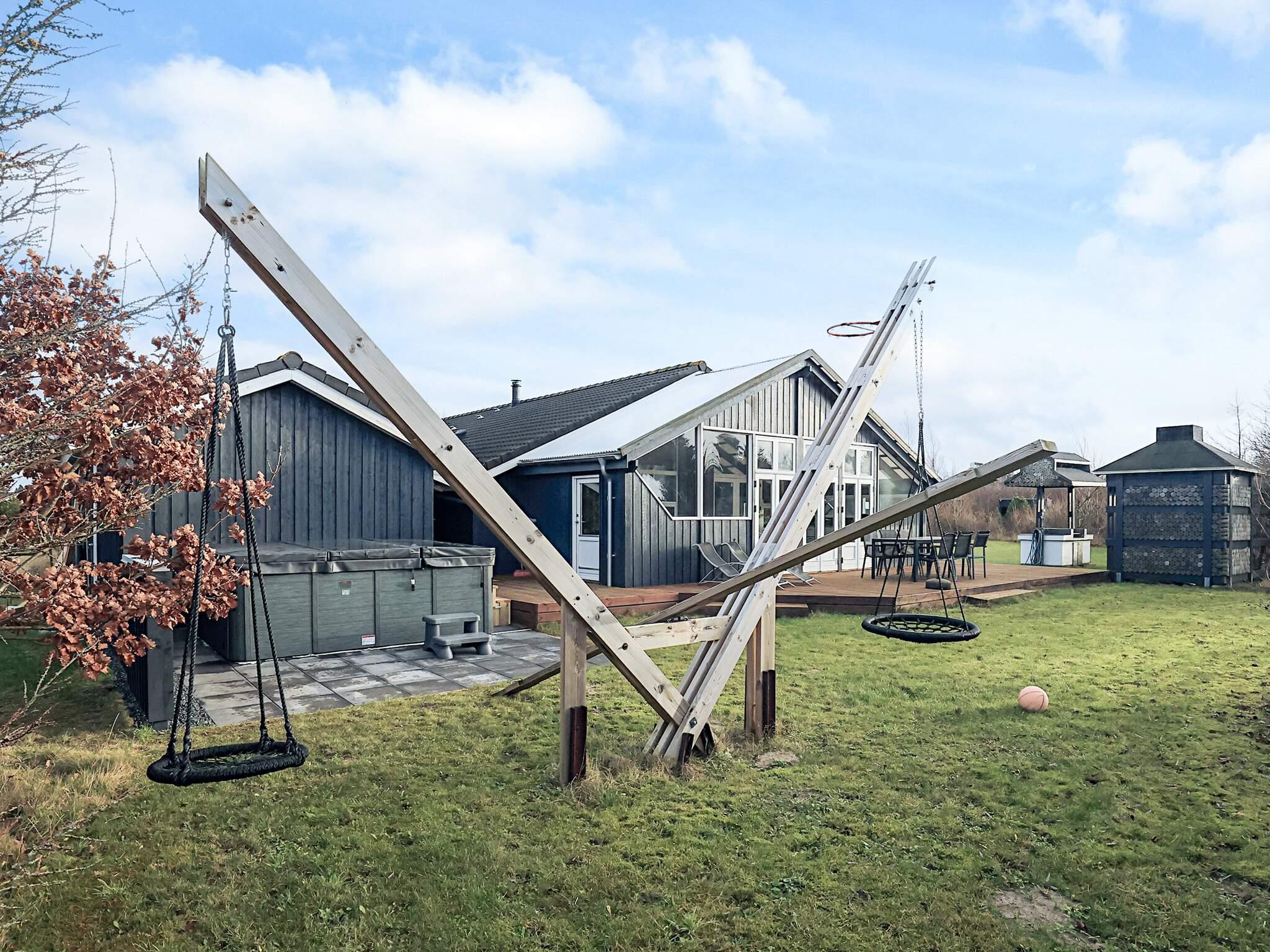 Sommerhus med masser af plads, personlig indretning i meget høj kvalitet, mange ekstra faciliteter og en solrig, sydvestvendt udestue på 35 m². Der er to badeværelser med gulvvarme og bruseniche, hvoraf det ene har spabad og sauna. I aktivitetsrummet er der bordtennis, shuffleboard, billard, Nintendo Wii, PS3 og motionsredskaber. Opholdsstue i åben forbindelse med køkkenet, der bl.a. har amerikansk køleskab med isdispenser. Fra den rummelige og lyse opholdsstue samt fra udestuen er der adgang til terrasserne og plænegrunden. Det ene soveværelse har elevationssenge, alle værelser har eget tv. Udekøkkenet har eget køleskab, koldt/varmt vand samt gasblus. Omkring huset er der åben terrasse og der er en stor 9 personers udespa opstillet på terrassen, som indbyder til udendørs afslapning året rundt. Grunden er en plan naturgrund. Til børnene er der gynger, sandkasse og legehus. Desuden er der shelter, bålsted, muret grill og gas-wok.