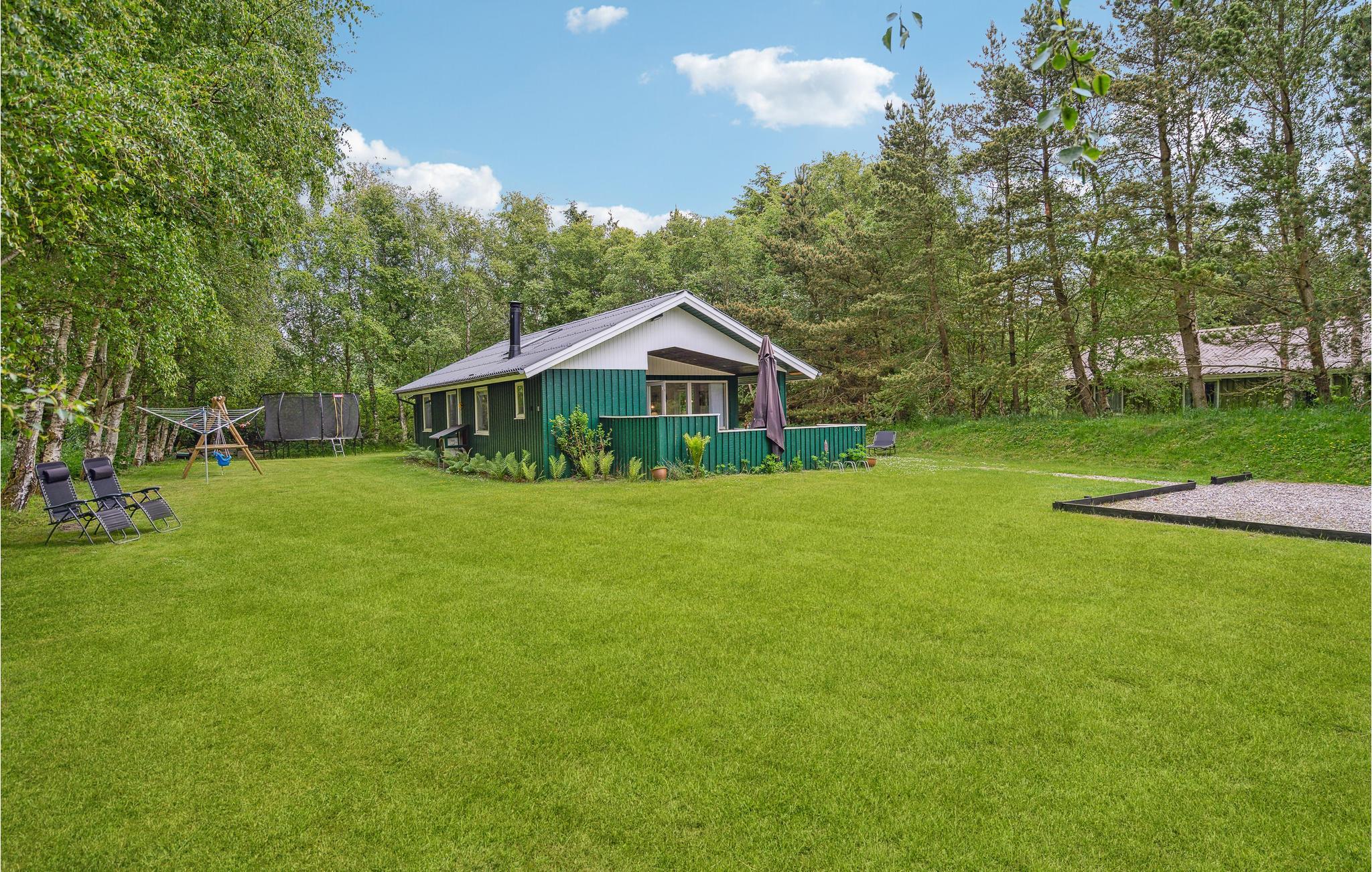 Charmerende feriehus nær skov på en stor naturgrund med bålplads, trampolin, gynge og sandkasse.