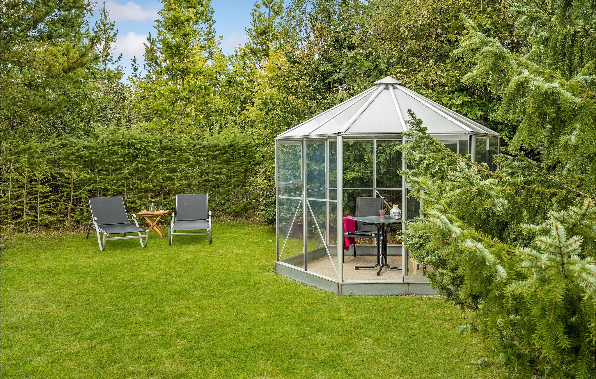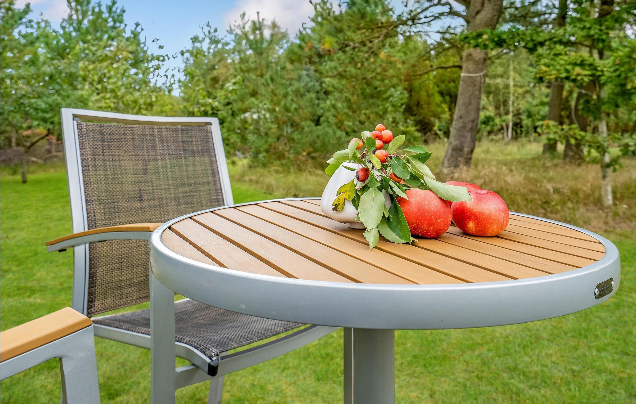 Fra stuen træder man ud på en overdækket terrasse med havemøbler og terrassevarmer. I løbet af sommerdagene kan I slappe af på terrassen eller i hængekøjen, mens børnene boltrer sig på græsplænen. Afslut dagen med en kop kaffe i den lille pavillon.
