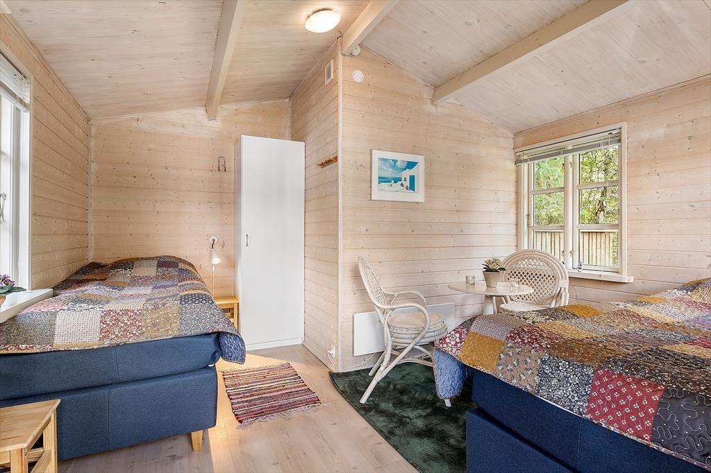 Med loft til kip, lys træbeklædning og brændeovn er sommerhusets opholdsrum sådan et, du straks kan føle dig hjemme i. Der er en komfortabel sofa og lænestole, når det er tid til at flade ud med bøger eller en god film på fladskærmen, og ved spisebordet nær det åbne køkken, kan du samles med dine kære til lækre måltider, brætspil og gode grin. Saunaen, der ligger i forlængelse af badeværelset, er perfekt, når du trænger til at slappe helt af i kroppen og lade feriefreden indfinde sig. Når det er sengetid, er der to soveværelser til rådighed, og derudover kan de to hemse og annekset også bruges til overnatning. Bemærk dog, at sovepladserne på hemsene egner sig bedst til børn og unge.