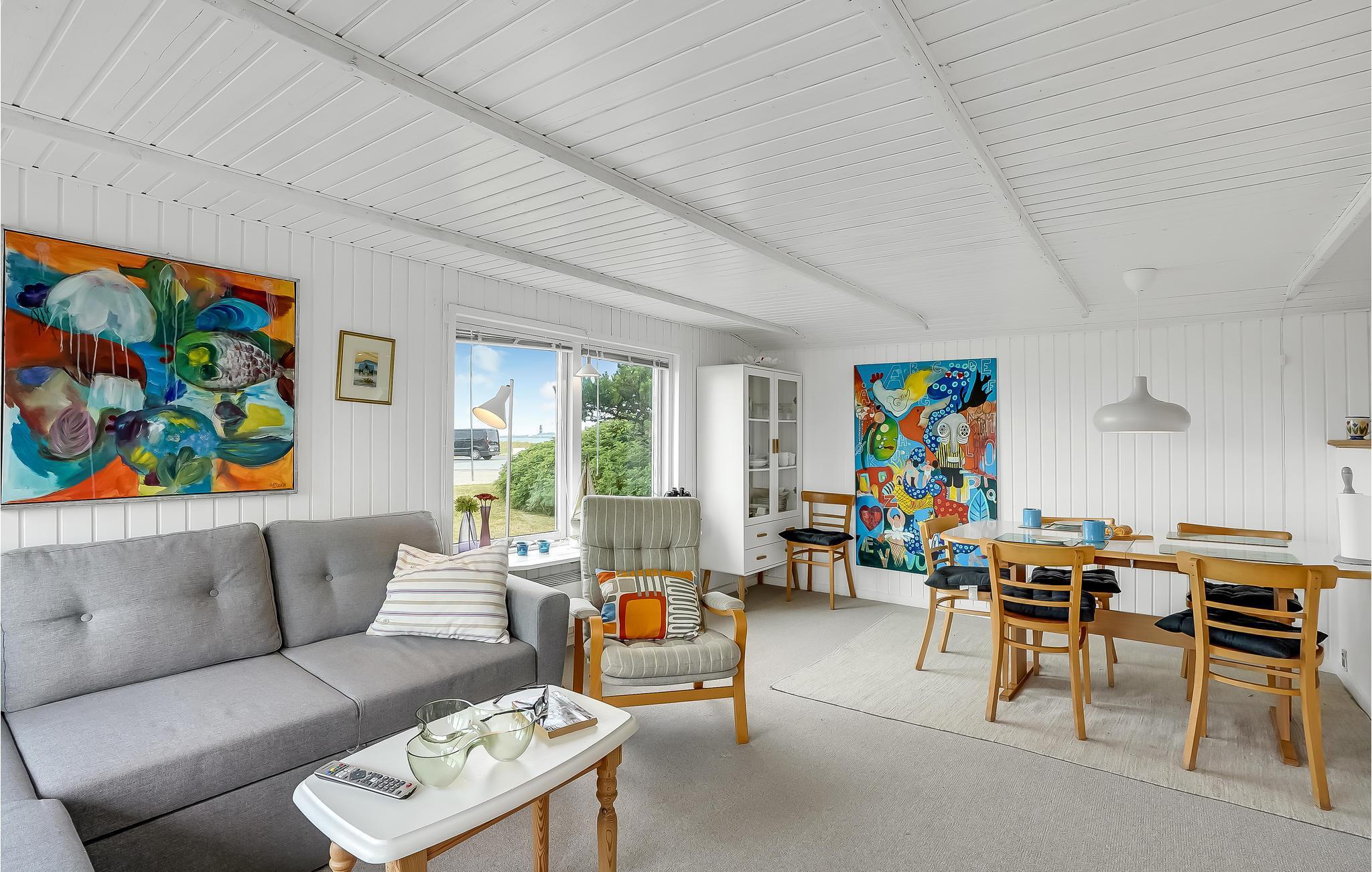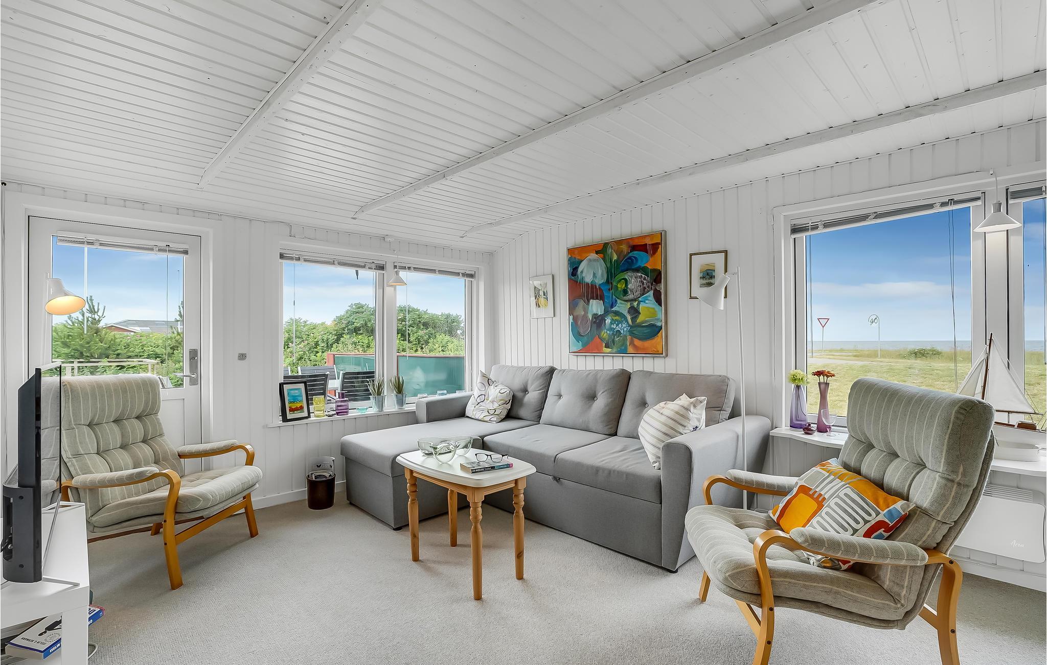 Nyd udsigten fra stuen gennem de store vinduer, der lukker dejligt meget dagslys ind. De hyggelige møbler og den smagfulde indretning gør dette feriehus til et behageligt sted at være på ferie ved havet. Det kan rumme op til 6 personer.