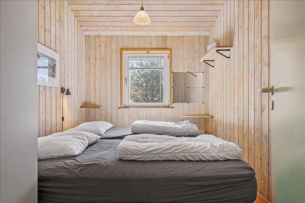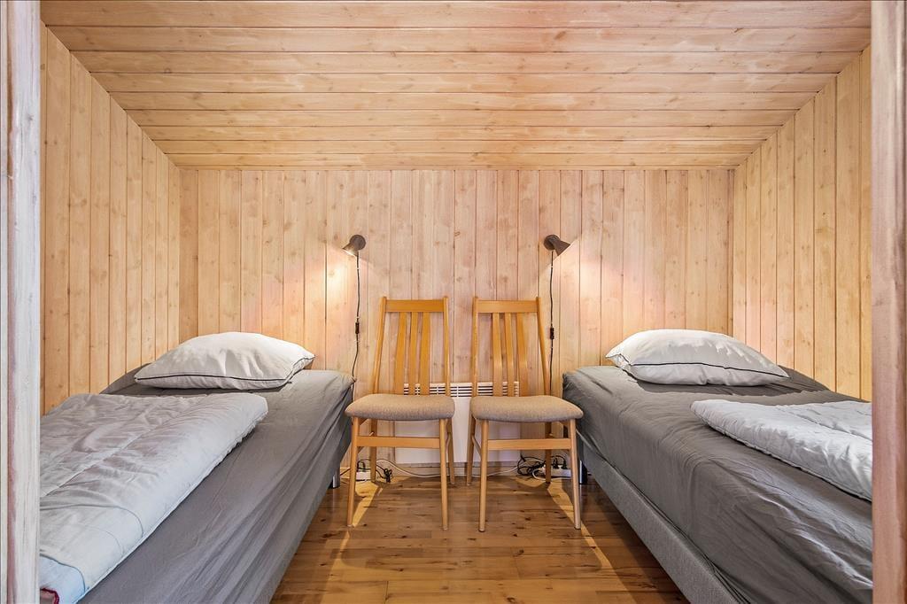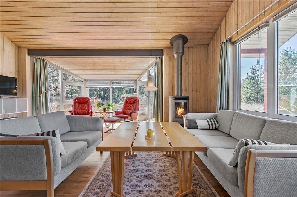 Sommerhusets indretning er perfekt for en børnefamilie, og der er endda plads til bedsteforældrene, hvis det ønskes. To badeværelser med bruser gør morgenerne nemme og uden kø. Til en rolig aften kan du tage en tur i saunaen og slappe af i spabadet. Du kan også læne dig tilbage i en af stuens sofaer med en spændende krimi i hånden og ild i brændeovnen. I løbet af dagen strømmer sollyset ind gennem de store vinduer og giver en smuk udsigt til naturgrunden. Og når du føler for at komme ud i det fri, kan du blot åbne terrassedøren og træde direkte ud i naturen.
