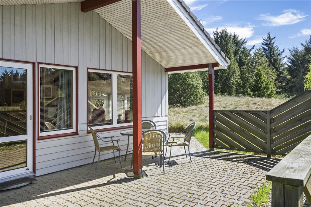 Rundt om sommerhuset finder du flere terrasser, hvor du kan sætte dig og nyde solen på det bedste sted. Naturgrunden er imponerende stor med sine 3600 m², og de små fyrretræer og den spredte bevoksning smelter smukt sammen med de naturskønne omgivelser. Udemiljøet ved sommerhuset er et vidunderligt sted at slappe af og genoplade – måske i skyggen af en parasol med en svalende drink eller ved grillen, når det er tid til aftensmad.